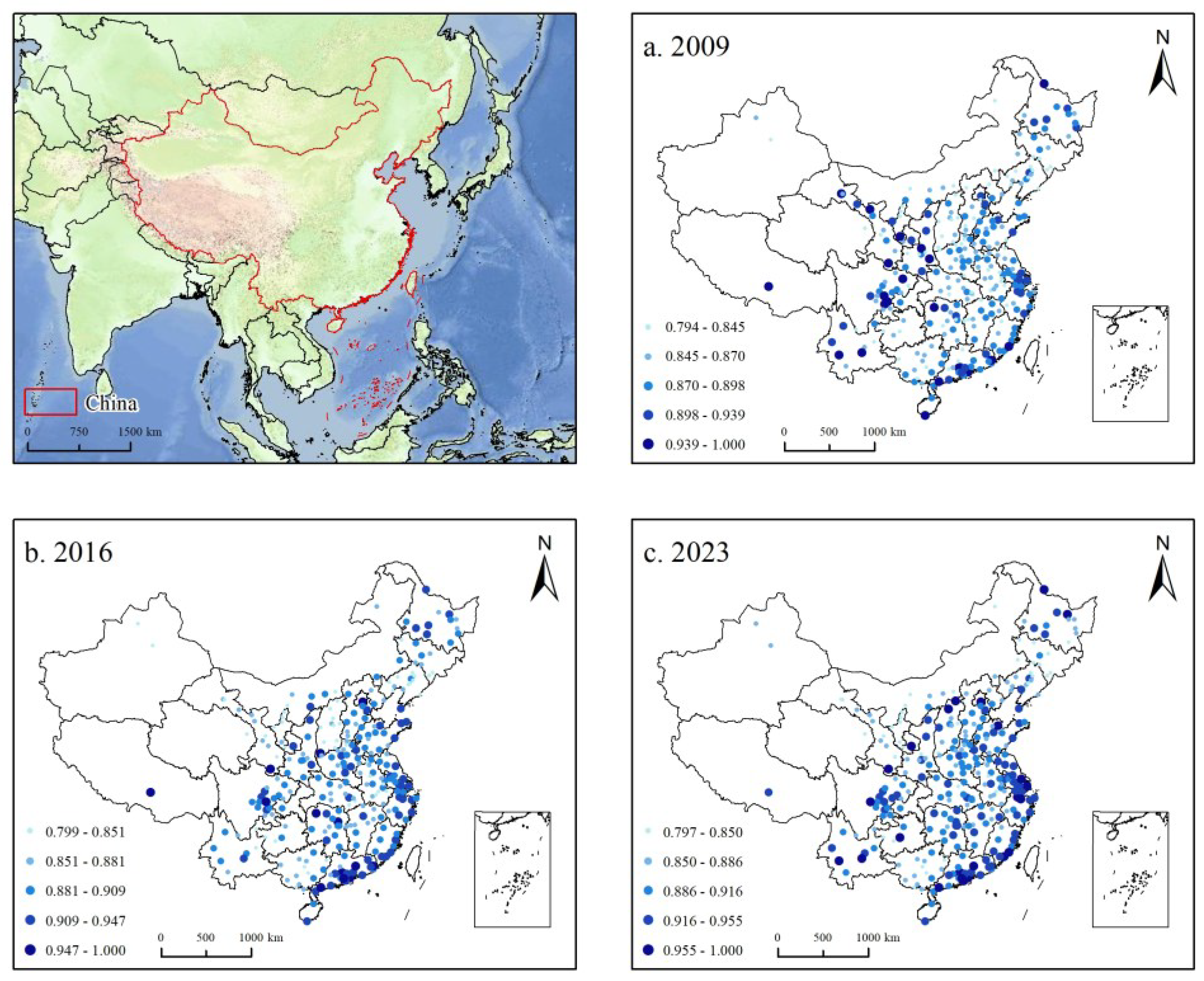 Analysis of China’s urban land use efficiency measurements from 2009, 2016, and 2023 reveals a steady overall improvement in efficiency levels throughout the observation period (Figure 2). From the perspective of spatial pattern evolution, spatial non-uniformity in land use efficiency persists and may exhibit increasingly complex patterns. Leading regions such as the eastern coastal areas are likely to maintain their advantage, while certain inland regions face challenges in enhancing efficiency [46,53].