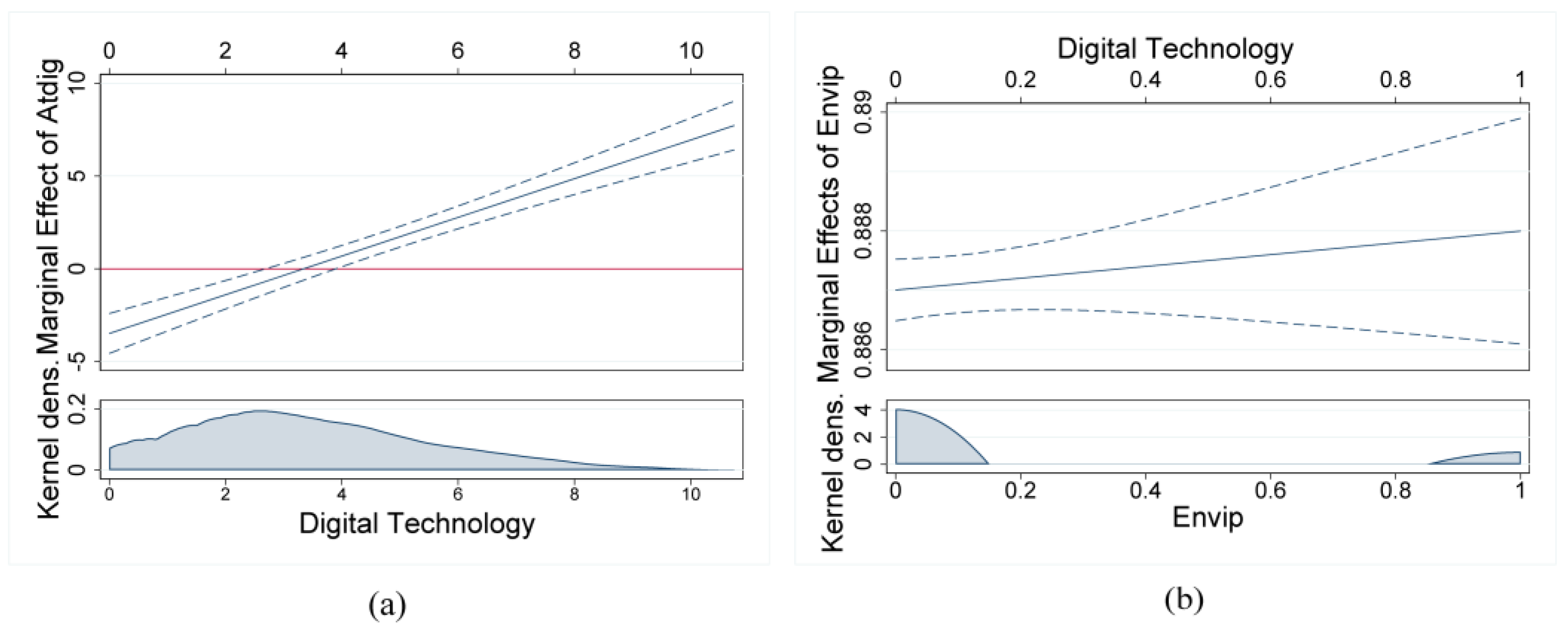 Based on information economics and government behavior theory, this study introduces the Government Digital Attention (Atdig) variable to examine whether strategic government emphasis and policy signals can amplify the enabling effects of digital technologies. The signals of digital focus conveyed by the government through policy documents and development plans not only reduce market uncertainty and guide the allocation of production factors toward the digital sphere but also strengthen the digital consensus between government and enterprises, creating a more favorable institutional environment for the research, development, and application of digital technologies. Therefore, by conducting a textual analysis of the full texts of government work reports from various cities, we calculated the total word frequency associated with keywords such as digital economy, artificial intelligence, big data, and Internet Plus. This word frequency serves as a metric for assessing the level of digital focus within government policies. We anticipate that the high level of government attention to digitalization will complement digital technologies, amplifying their positive impact on enhancing land use efficiency. Column (1) results in Table 9 show that the interaction term between digital technology (Dig) and government digital attention (Atdig) (c.Dig##c.Atdig) is significantly positive at the 1% level. This indicates that government digital attention significantly amplifies the positive impact of digital technology on land use efficiency. In cities where governments prioritize digital development, the application of digital technology benefits from clearer policy expectations, more robust resource support (such as fiscal subsidies and data openness), and more efficient administrative services. Consequently, it can more seamlessly integrate into all stages of land planning, management, and monitoring, ultimately driving more effective intensification and intelligent transformation of land use. The above conclusions are visually presented in Figure 3a. Figure 3a shows that when government digital attention is low, the marginal curve of digital technology’s impact on land use efficiency is relatively flat. However, when government digital attention reaches higher levels, the marginal effect curve steepens and consistently remains above the zero line. These results also indicate that enhanced government policy signals can significantly expand the scope of digital technology’s contribution to land use efficiency, validating the critical guiding role of government actions in the implementation of digital technologies.