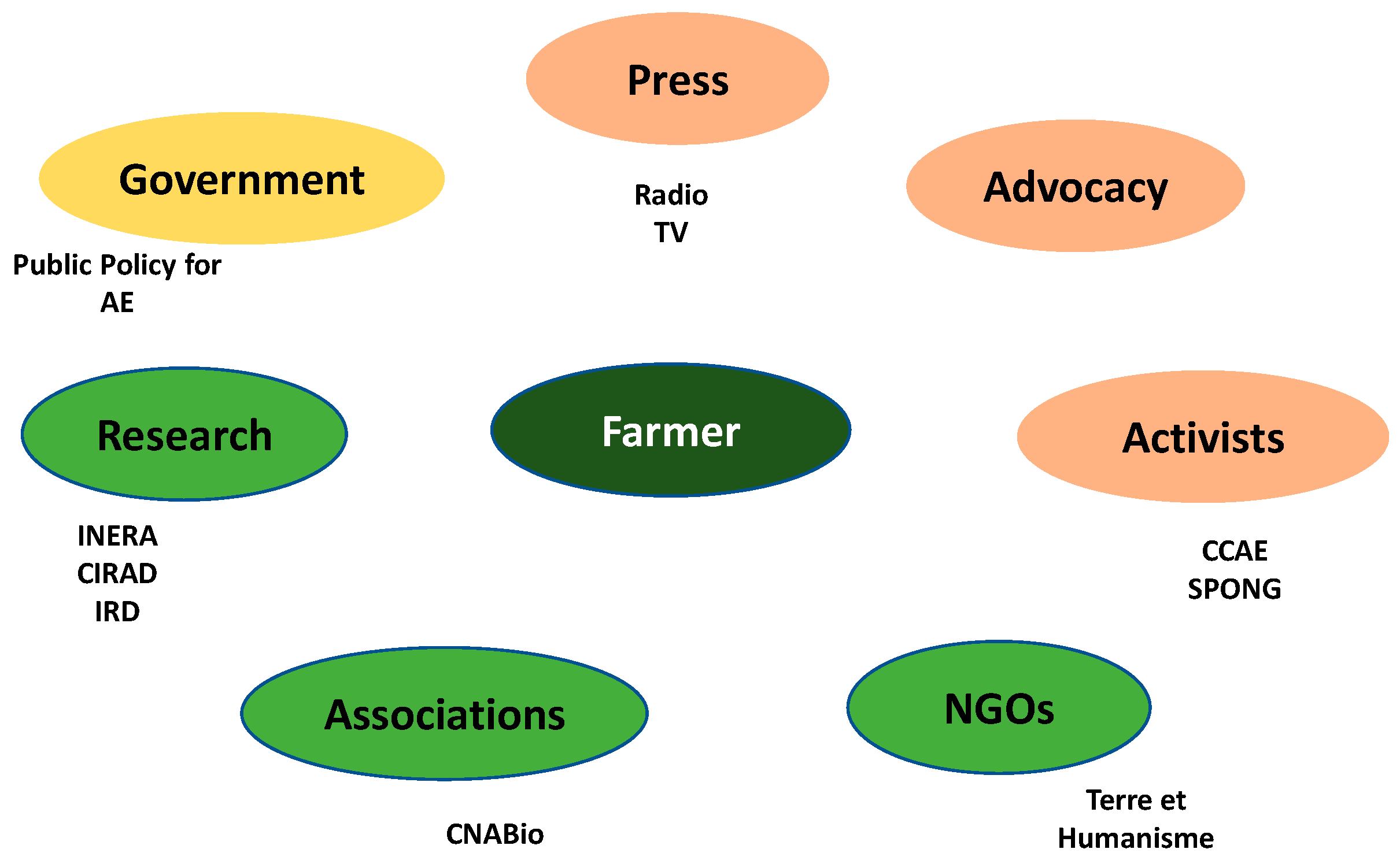 - Bellon, S.; Ollivier, G. L’agroécologie en France: L’institutionnalisation d’utopies. In L’agroécologie en Argentine et en France. Regards Croisés; Goulet, F., Magda, D., Girard, N., Eds.; l’Harmattan: Paris, France, 2012; pp. 55–90. [Google Scholar]