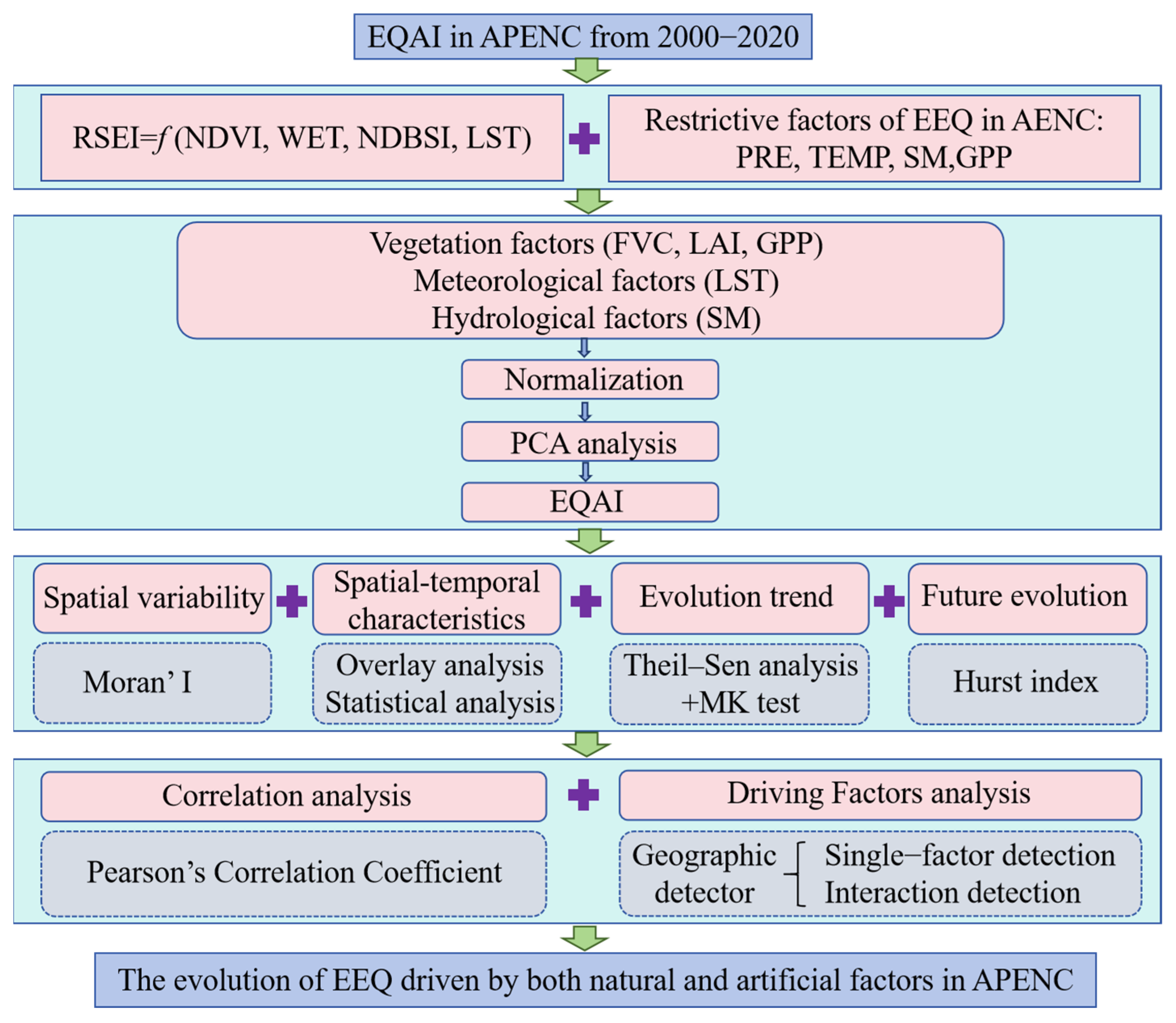 The spatiotemporal patterns and dynamics of EQAI in the APENC from 2000 to 2022 were analyzed in this study. In accordance with the environmental characteristics of the APENC, three ecological indicators (vegetation factors, meteorological factors, and hydrological factors), including five indexes (FVC, LAI, GPP, LST, and SM), were incorporated to develop the EQAI based on principal component analysis (PCA). Subsequently, the spatial auto-correlation of EQAI was analyzed employing Moran’s I to examine the spatial clustering of the data. Furthermore, the spatiotemporal variation in the EEQ of APENC was examined based on EQAI data. The trend and dynamic patterns of EEQ were systematically analyzed using Sen-MK spatial analysis in the study area. Finally, the impact of natural—and artificial drivers on EEQ was evaluated using correlation analysis and geographic detector. The detailed workflow is presented in Figure 2.