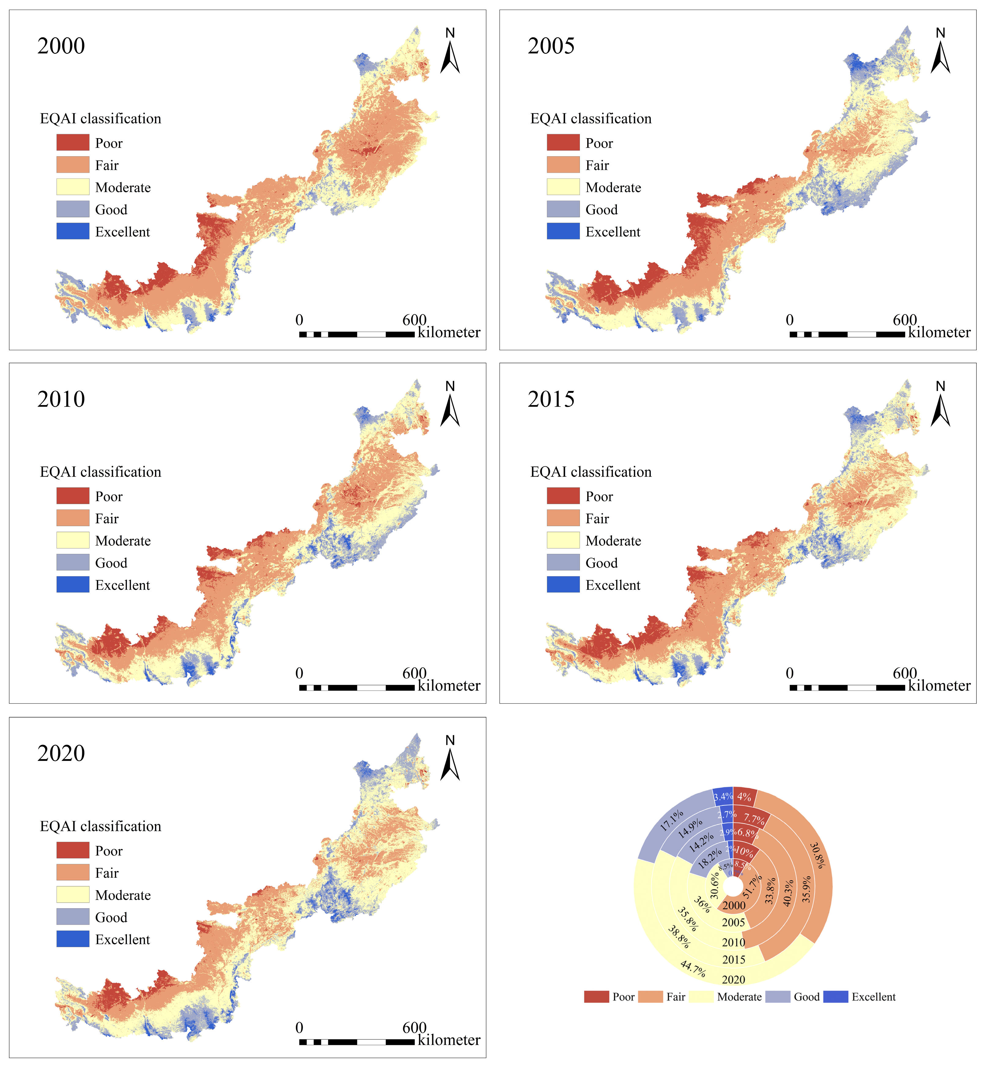 Figure 3. The spatiotemporal distribution of EQAI in APENC from 2000 to 2020 and the proportion of ecological grades.