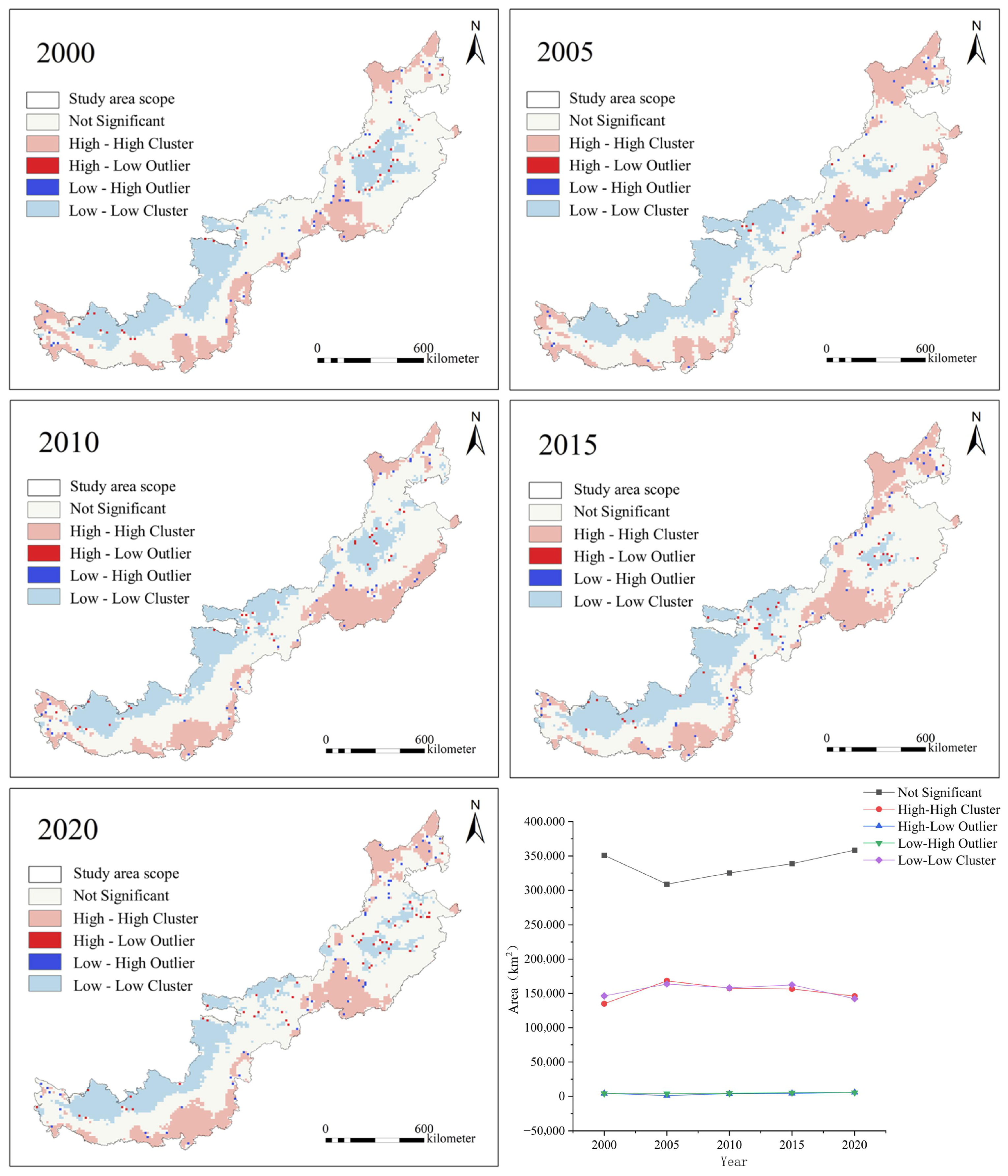 Table 3 shows the global Moran’s I of the EQAI in the APENC from 2000 to 2020. It can be seen that the global Moran’s I values were consistently positive, and all associated p-values were below 0.01 and z-scores exceeded 2.58, corresponding to a 99% confidence level from 2000 to 2020. These results indicate a 99% certainty that EQAI was positively correlated and significantly aggregated in space. Between 2000 and 2005, the global Moran’s I increased from 0.7717 to a peak value of 0.8367, reflecting that the highest level of spatial agglomeration occurred in that year. However, it slightly decreased to 0.7557 in 2020, indicating a weakening of spatial aggregation. This might be attributed to the fact that the effects of ecological restoration projects began to emerge in 2005, resulting in a stronger aggregation effect of EEQ.