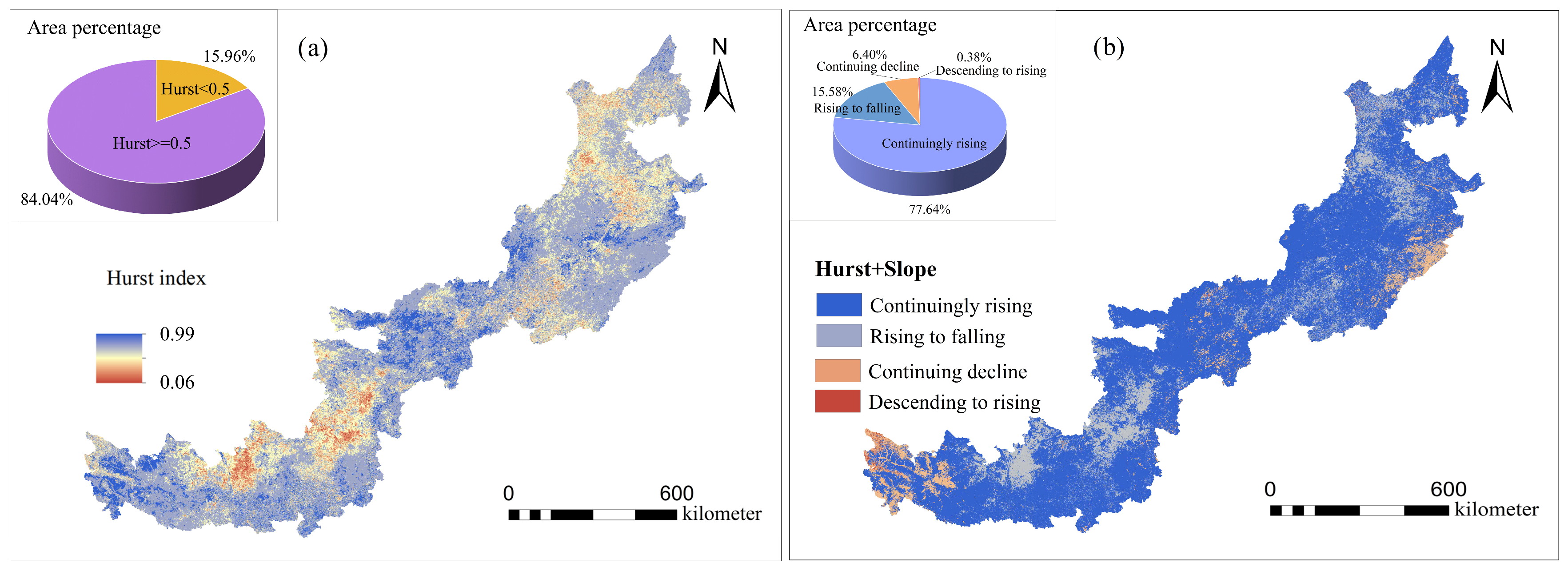Figure 7. (a) The spatial distribution of the Hurst exponent of the EQAI from 2000 to 2020, and (b) the distribution of future trends in the EQAI.