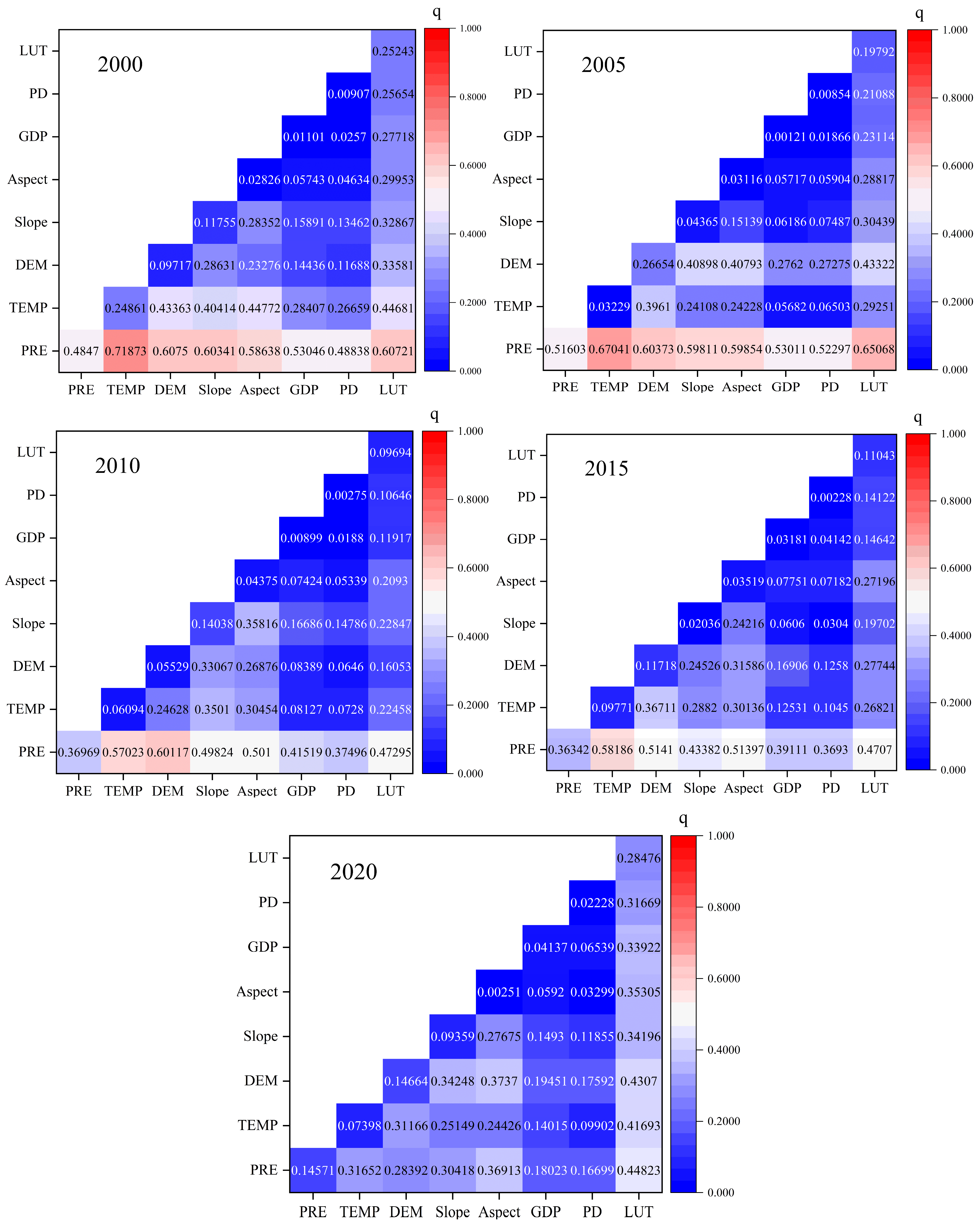 By analyzing the interaction intensity among different influencing factors, it can be determined whether the combined explanatory strength of two factors (X1 and X2) together for EQAI (Y) increases or decreases [45]. The result was acquired by q-value [q(X1∩X2)] (Table 2).