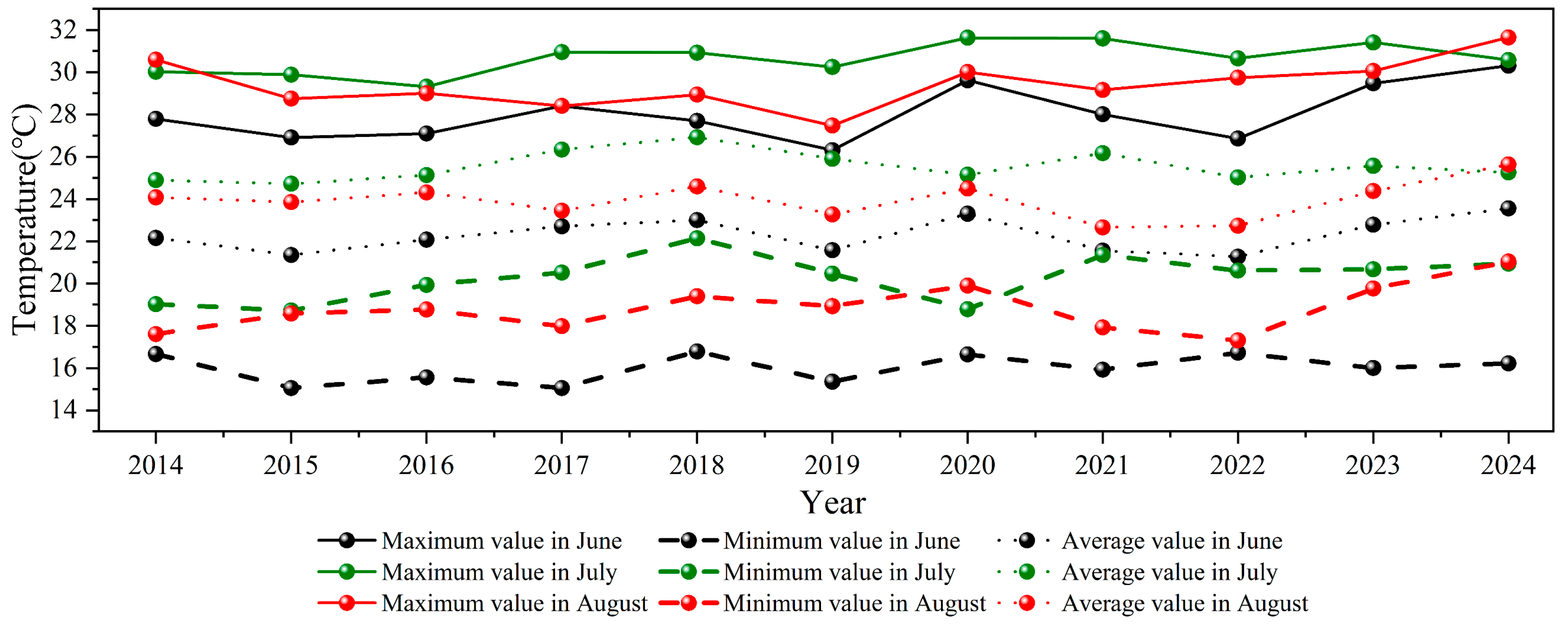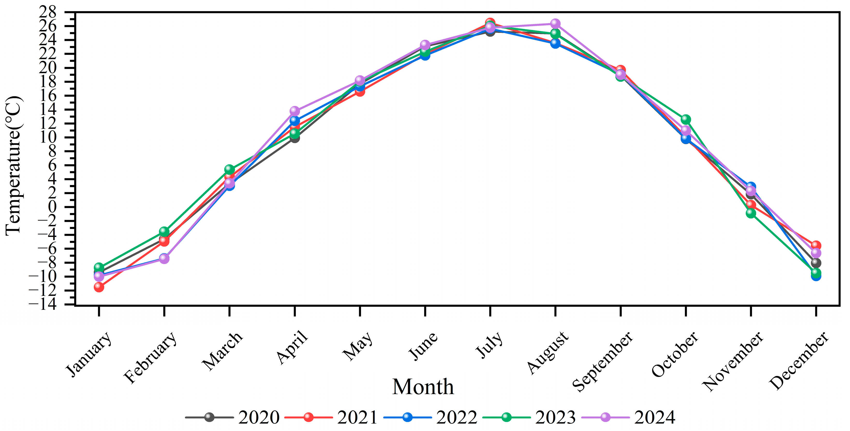 - Shenyang Daily. 2024 Shenyang Climate: Higher Temperatures, More Precipitation, and Fewer Sunshine Hours. 20 January 2025. Available online: https://www.syd.com.cn/newscenter/content/2025-01/20/content_143904.html (accessed on 20 October 2025).