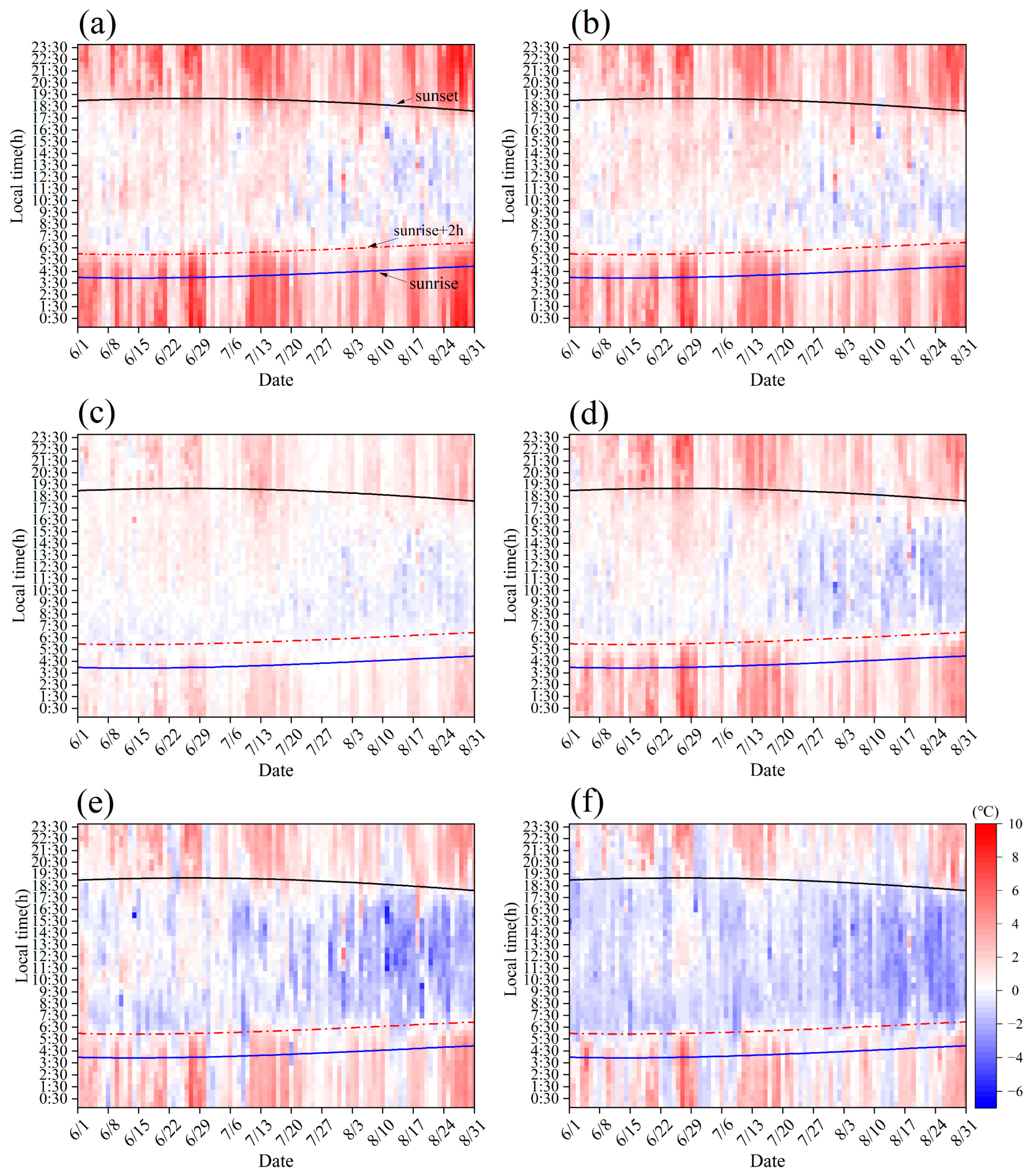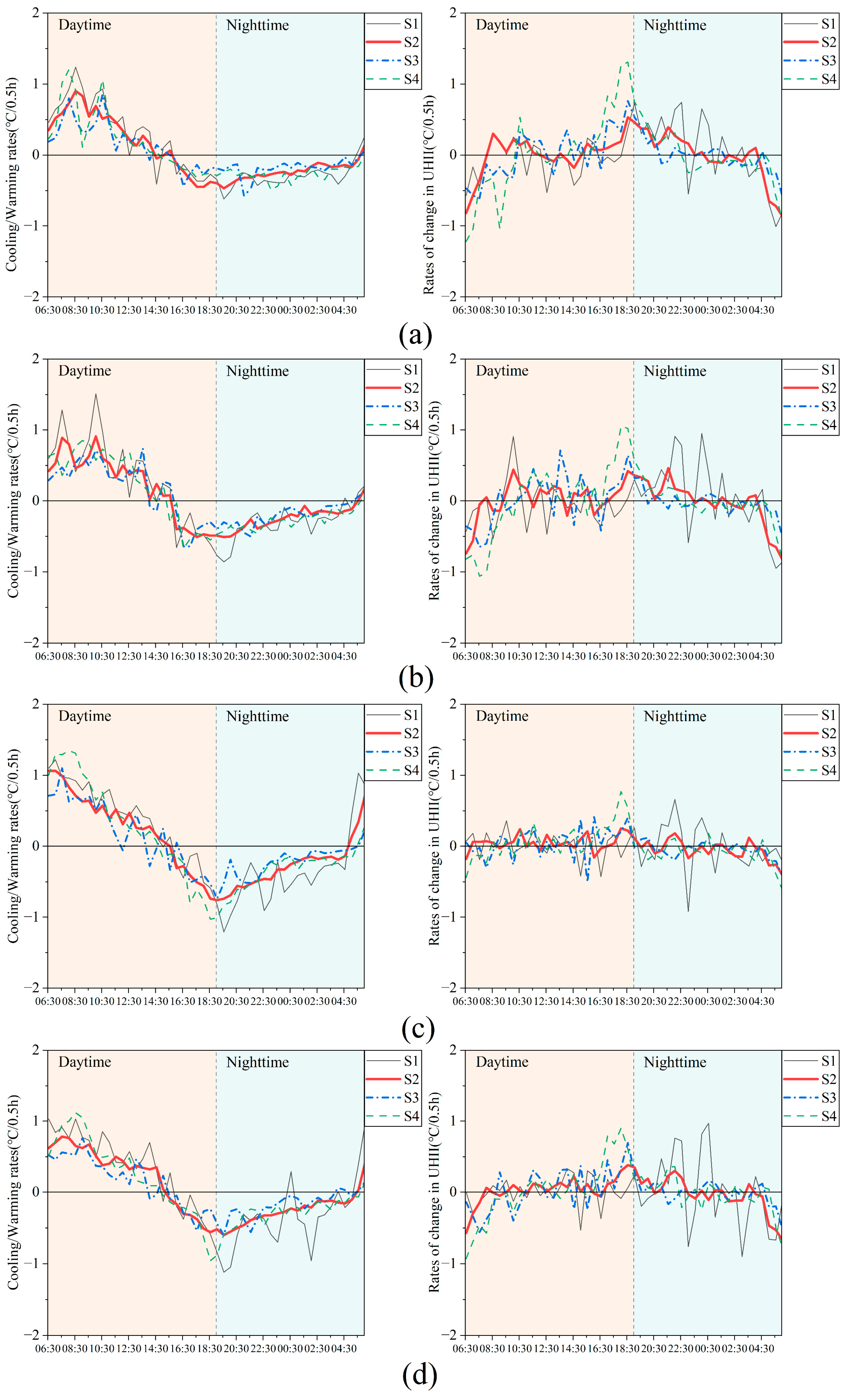 3.2.2. Characteristics of Temperature and Heat Island Intensity Changes in Four Summer Phases