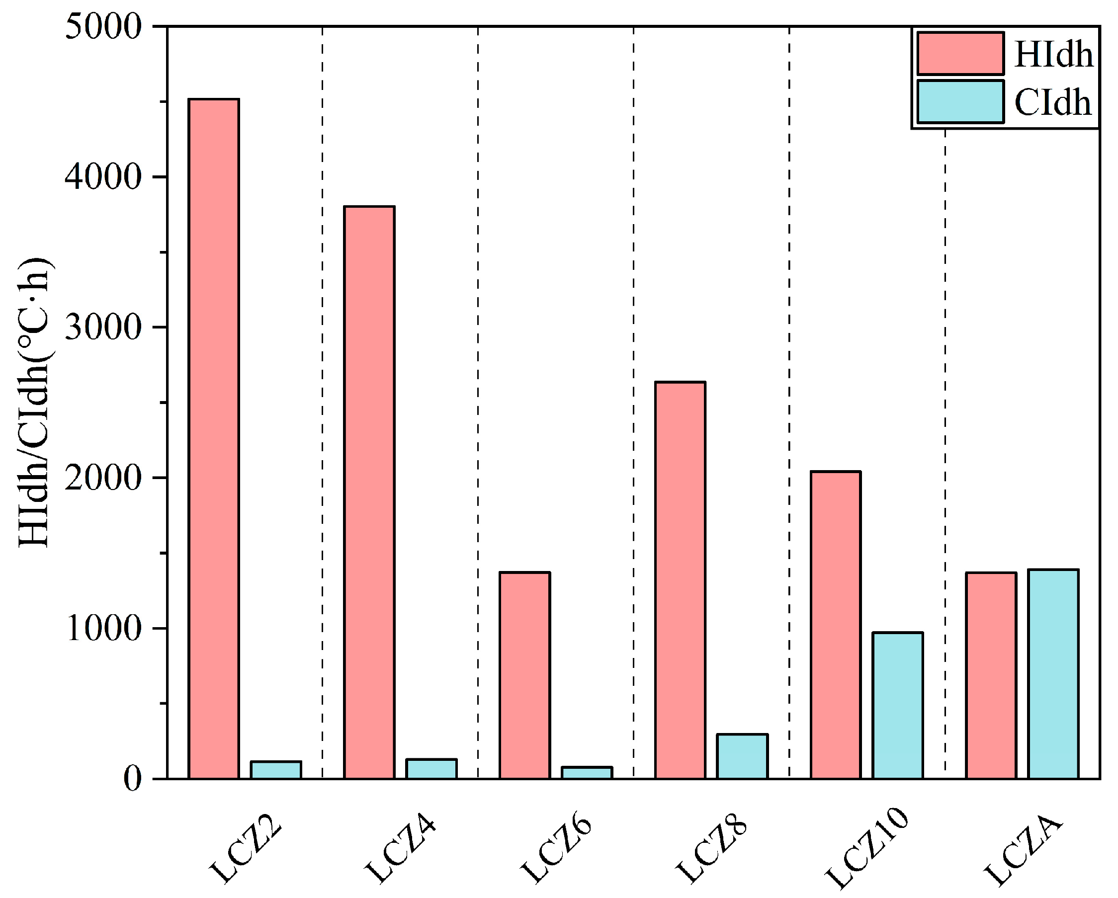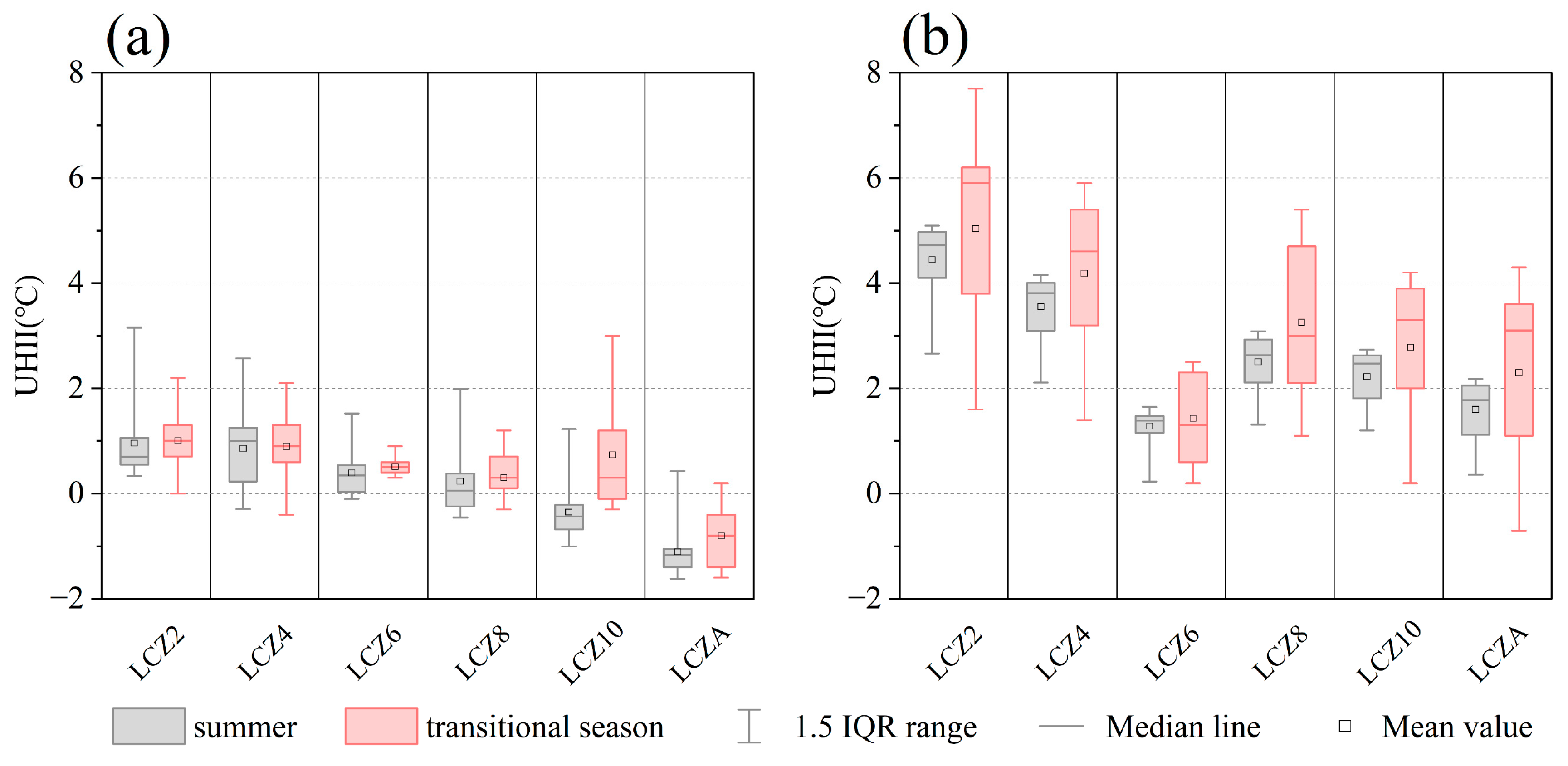 - In terms of UHII change rates based on the stage subdivision of summer, the fluctuations for each LCZ were most dramatic in early-summer and late-summer. In contrast, the UHII of built-type LCZs varied more gradually in mid-summer. During daytime, all LCZs experienced significant fluctuations in the four summer stages. The fluctuations in UHII for LCZ 6 were more pronounced than those for other LCZs across the four summer stages. During nighttime, the UHII of built-type LCZs varied more gradually in mid-summer and peak-summer.