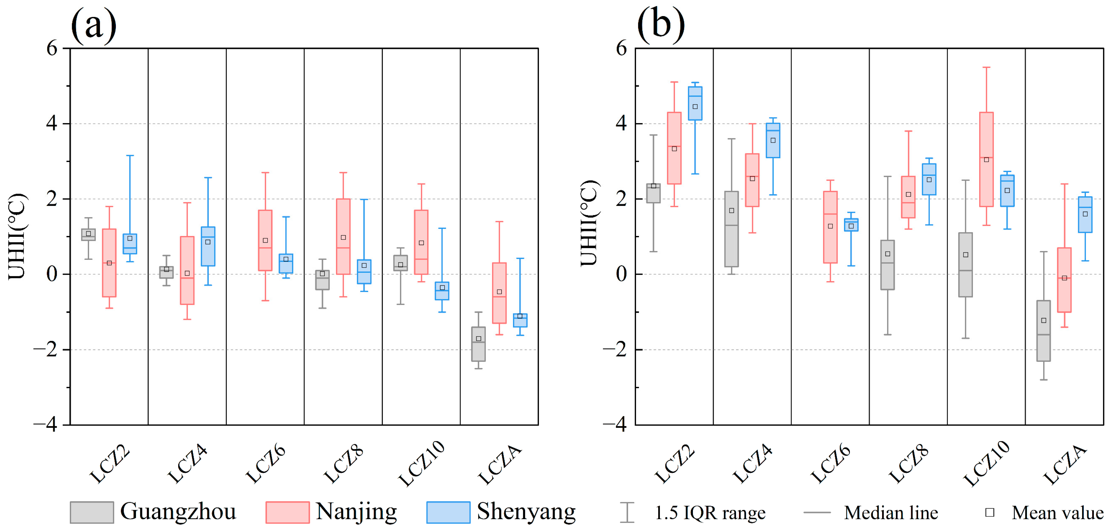 - In terms of UHII, the summer UHI effect in Shenyang is characterized by higher intensity during nighttime and weakens significantly during the daytime. During nighttime, the UHII of built-type LCZs is higher than that of land cover-type LCZs. LCZ 2 and 4 show the highest UHII, at 7.6 °C and 5.4 °C. During the daytime, as summer progresses, the UCI effect in all LCZs gradually strengthens. LCZ 10 exhibits the most frequent daytime UCI effects among built-type LCZs. Further stage subdivision shows that, during daytime, the UCI effect in built-type LCZs persists longer in peak-summer and late-summer. LCZ A demonstrates a significant UCI effect across all four stages, with the strongest UHII reaching −2.8 °C at 09:00 in late summer. During nighttime, the UHII of each LCZ in late-summer was higher than in the other three summer stages.