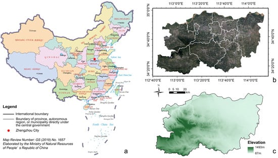 Location and administrative boundaries of the study area: (a) location of Zhengzhou City in China, (b) administrative boundaries and satellite image of Zhengzhou City in 2020. (c) Topographic map of Zhengzhou City.