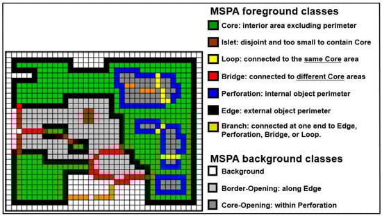 Classification of landscape types in Morphological Spatial Pattern Analysis (MSPA) and their corresponding definitions. Source: European Commission, Joint Research Centre (JRC). Available online: https://forest.jrc.ec.europa.eu/en/activities/lpa/mspa/ (accessed on 15 November 2025).