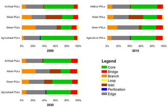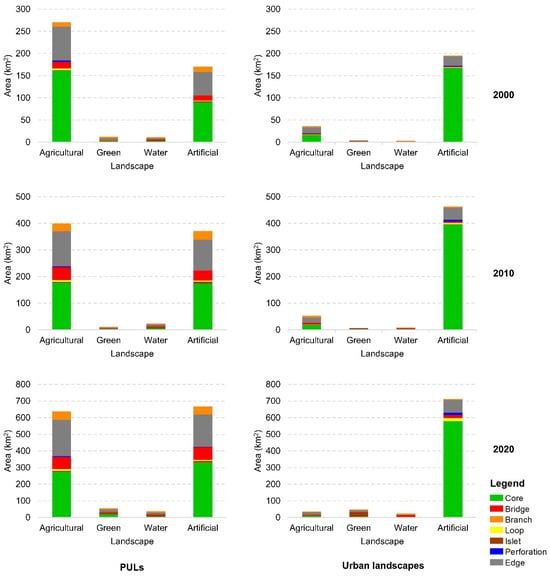 In artificial urban landscapes, the Core areas consistently accounted for more than 80%, resulting in only minor proportions and limited temporal changes in other morphological forms. In contrast, artificial PULs exhibited a lower mean Core proportion (approximately 49%), while other morphological categories occupied a larger share than in urban landscapes; for example, the Bridge increased from 6% to 11%.