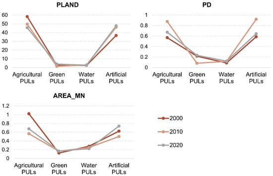 PD and AREA_MN reflect the degree of landscape fragmentation. At the landscape level, PD exhibited a trend of initial increase followed by a decrease from 2000 to 2020 (Table 3). During the period from 2000 to 2010, the overall increase in PD was primarily driven by the rising PD of agricultural and artificial PULs, despite a significant decline in the PD of green PULs. Conversely, from 2010 to 2020, the decrease in PD for agricultural and artificial PULs contributed to the overall decline in PD, while the green PULs continued to exhibit an opposite trend (Figure 6).