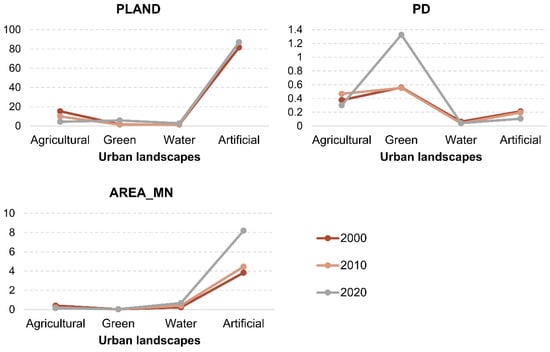 From 2000 to 2020, the PD of urban landscapes exhibited a continuous increase, while the AREA_MN consistently declined. These changes indicate a clear trend of fragmentation in urban landscapes, a trend that became more pronounced during the 2010–2020 period. In contrast, PULs demonstrated a trend toward reduced fragmentation over the same period (Table 3). At the class level, notable changes included an increase in PD for green urban landscapes and an increase in AREA_MN for artificial urban landscapes, both of which occurred primarily between 2010 and 2020 (Figure 7). The SHDI for urban landscapes was significantly lower than that of PULs, indicating lower landscape diversity (Table 3). Combined with the PLAND, the dominance of artificial urban landscapes suggests that most urban areas are characterized by a homogeneous landscape structure dominated by artificial landscapes (Figure 7).