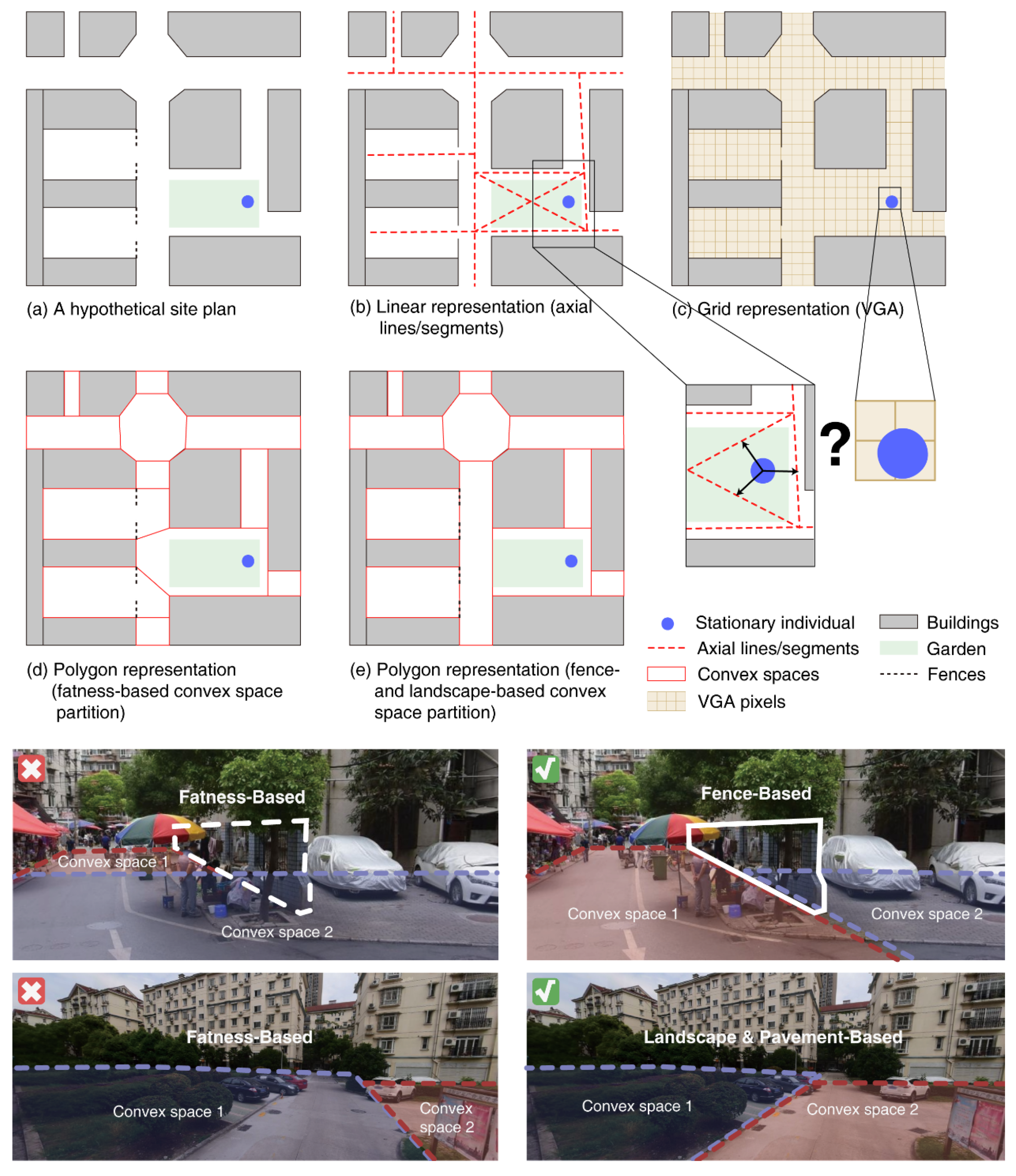 - Perimeter enclosure: the ratio of facade length facing a convex space to its total perimeter (Figure 6b), with 1 indicating full enclosure and 0 complete openness.