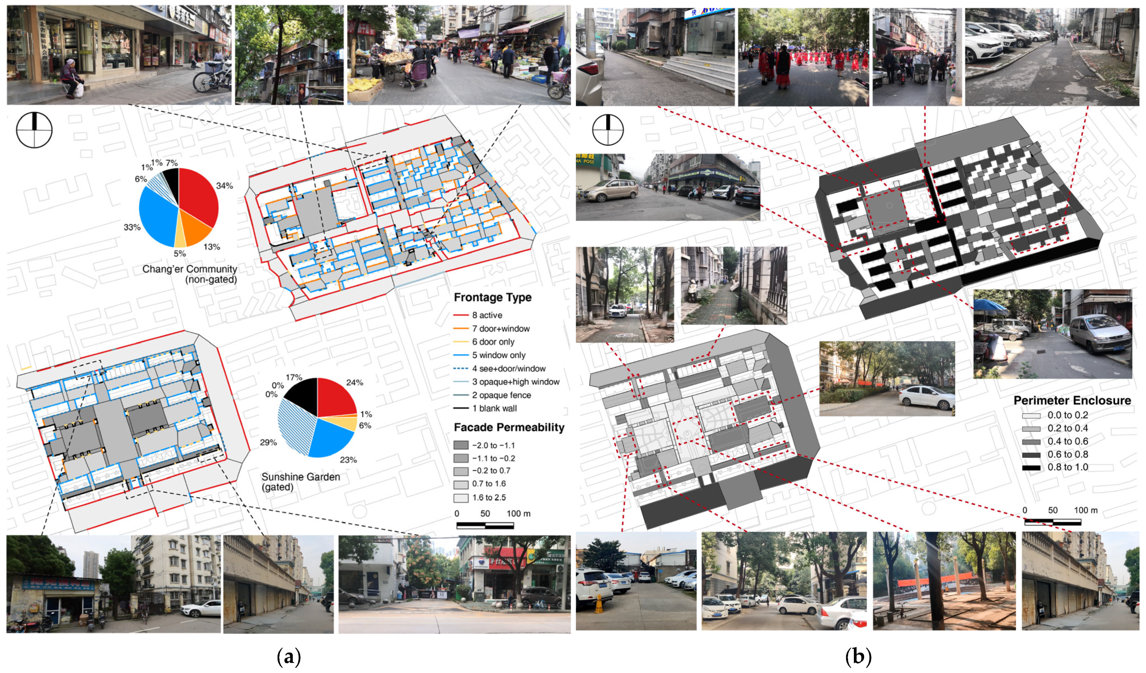 - Facade permeability: a composite indicator quantifying physical and visual permeability of ground-floor frontages, based on eight frontage types (e.g., “active frontage”, “door and window”, “see-through fence”, “blank wall”) weighted by their permeability and potential attraction for outdoor activities (see Figure 6a and Table 1).