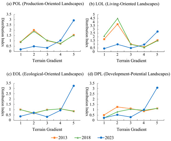 2.3.1. Landscape Pattern Differentiation Characteristics Across Terrain Gradients