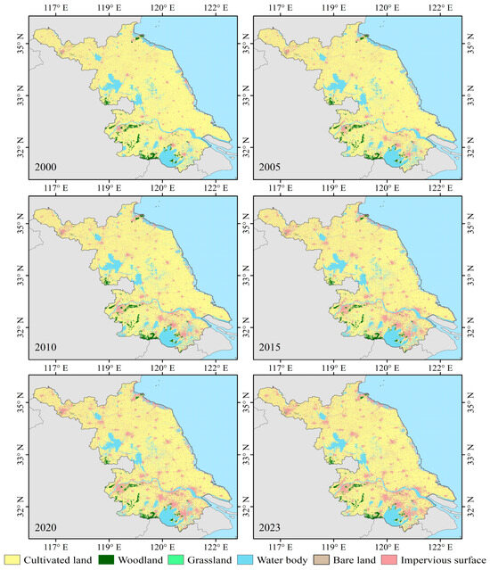 Spatial distribution of land use in Jiangsu Province in six periods from 2000 to 2023.