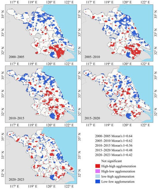 (1) High–high agglomeration areas (where both the areas themselves and their surrounding non-agriculturalization rates are high): During the initial period from 2000 to 2010, these areas were predominantly located in the core region of southern Jiangsu, specifically in cities such as Suzhou, Wuxi, Changzhou, and parts of Nanjing, with a relatively concentrated distribution. However, after 2010, the number of high–high agglomeration areas experienced a brief decline from 2010 to 2020. Subsequently, from 2020 to 2023, there has been a resurgence, particularly notable in 2016, with the agglomeration extending to regions adjacent to the Yangtze River in central Jiangsu, including Nantong and Yangzhou. This trend reflects the gradual expansion of ‘hot spots’ for non-agricultural land conversion from traditional southern Jiangsu to the riverside areas.