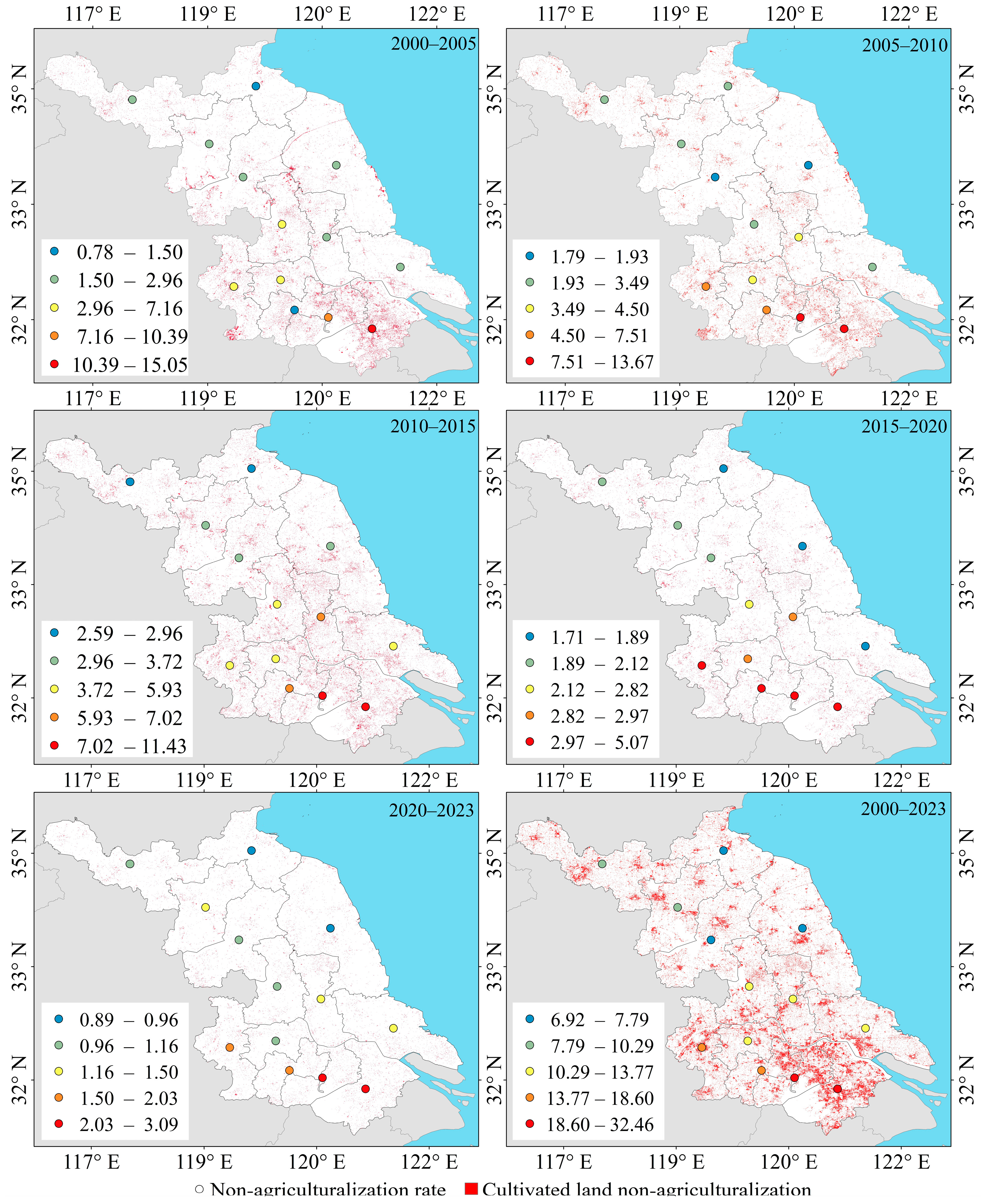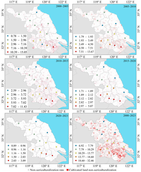 From 2000 to 2023, the spatial distribution of cultivated land non-agriculturalization in Jiangsu Province exhibits a strong correlation with the urbanization process. This pattern is characterized by core agglomeration in southern Jiangsu, regional gradient diffusion, and a gradual convergence in the later period. High non-agriculturalization rates have consistently been concentrated in the urban dense belts of southern Jiangsu. Specifically, a continuous high-intensity deagriculturalization zone extends from Nanjing eastward along the Yangtze River to Suzhou and Wuxi, where the non-agriculturalization rate predominantly ranges from 13.77% to 32.46%. This region represents the most significant area for the conversion of cultivated land to non-agricultural land within the province. In contrast, non-agriculturalization in central and northern Jiangsu is primarily localized around the urban areas of prefecture-level cities, exhibiting a scattered, point-like distribution. The cumulative non-agriculturalization rates in these areas are generally between 6.92% and 10.29%, indicating an overall intensity that is considerably lower than that observed in southern Jiangsu.