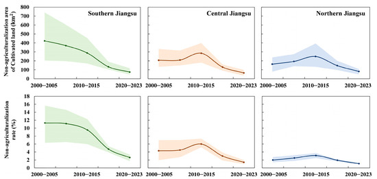 Changes in cultivated land area and non-agricultural land conversion rate in different regions of Jiangsu Province from 2000 to 2023.