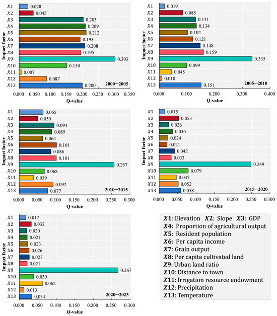 The results of the factor detector are illustrated in Figure 7. With the exception of the permanent population from 2000 to 2010 (X5) and the temperature from 2015 to 2023 (X13), as well as irrigation resource endowment (X11) and permanent population (X5), all other factors passed the significance test at p < 0.05. The average explanatory power of each factor regarding the non-agriculturalization of cultivated land across the three periods—2000–2010, 2010–2015, and 2015–2023—was 0.132, 0.195, and 0.115, respectively. These findings indicate significant differences in the intensity of the driving factors at various stages.