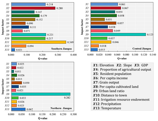 The detection results of driving factors for non-agricultural land use in different regions of Jiangsu Province from 2000 to 2023 are illustrated in Figure 9. The driving factors for the non-agricultural use of farmland in southern, central, and northern Jiangsu exhibit significant regional differentiation. In southern Jiangsu, the availability of irrigation resources stands out as the most critical driving factor. Conversely, in central Jiangsu, the proportion of urban land use has emerged as the primary driving factor, indicating that urbanization serves as the key impetus for the non-agricultural use of arable land in this region. The influence of other factors diminishes in a descending order, reflecting a comprehensive driving force that includes urbanization, terrain, agricultural economy, and population dynamics, with each factor’s impact being relatively more balanced compared to southern Jiangsu. In northern Jiangsu, the predominance of urban land use again emerges as the main driving factor, underscoring the significant role of urbanization in the non-agricultural utilization of arable land.
