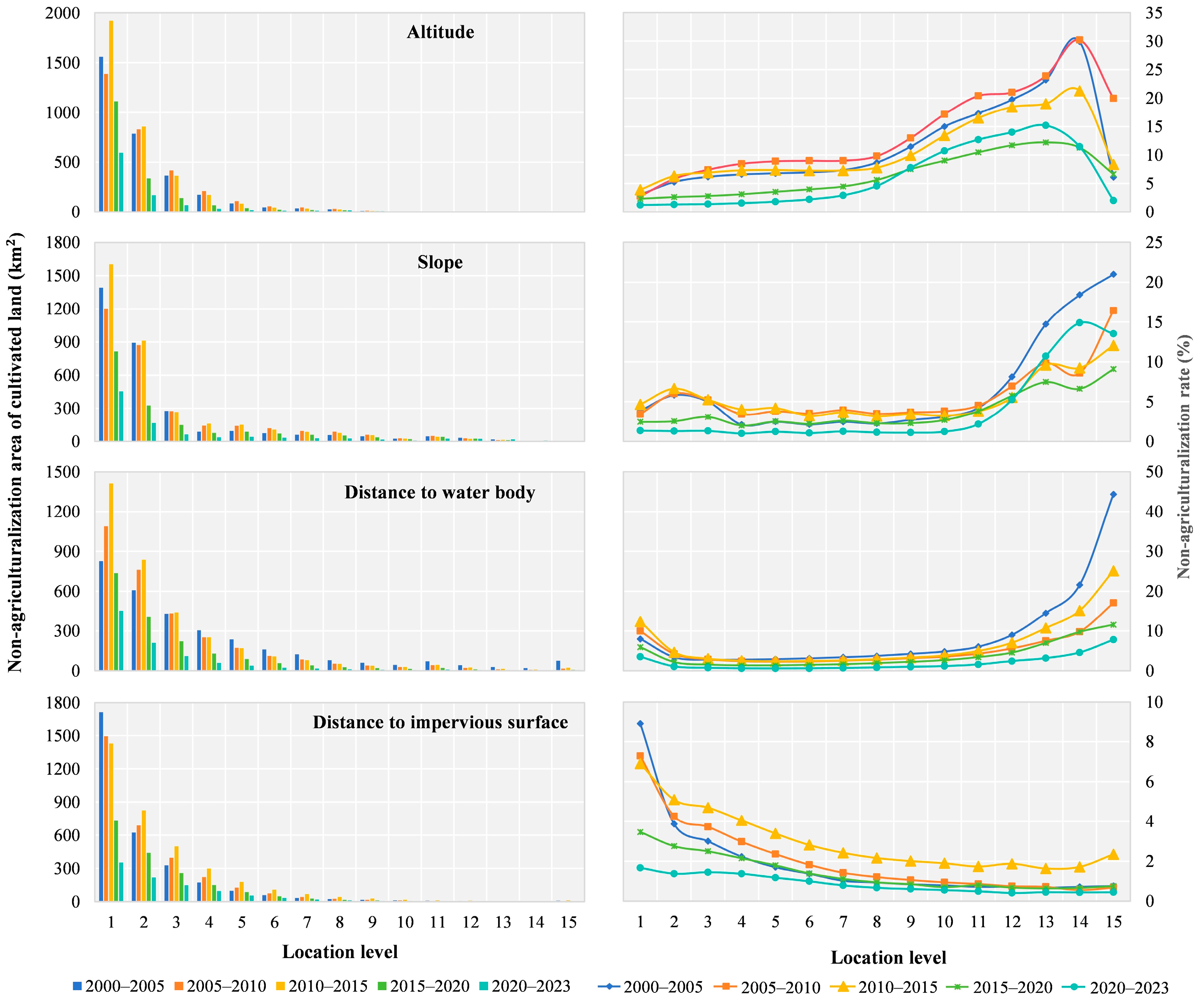 The non-agriculturalization rate increased significantly in the later stages, particularly from 2020 to 2023, indicating a marginal expansion into high-constraint locations. Only extremely high-constraint areas—such as those at level 15, with altitudes exceeding 200 m and slopes greater than 60°—remain limited in scale due to significant constraints. From a temporal perspective, the non-agriculturalization process initially concentrated on low location levels and has progressively advanced to medium and high location levels. This trend reflects the phased evolution of urban spatial expansion, transitioning from core lowlands to peripheral suboptimal or constrained locations.