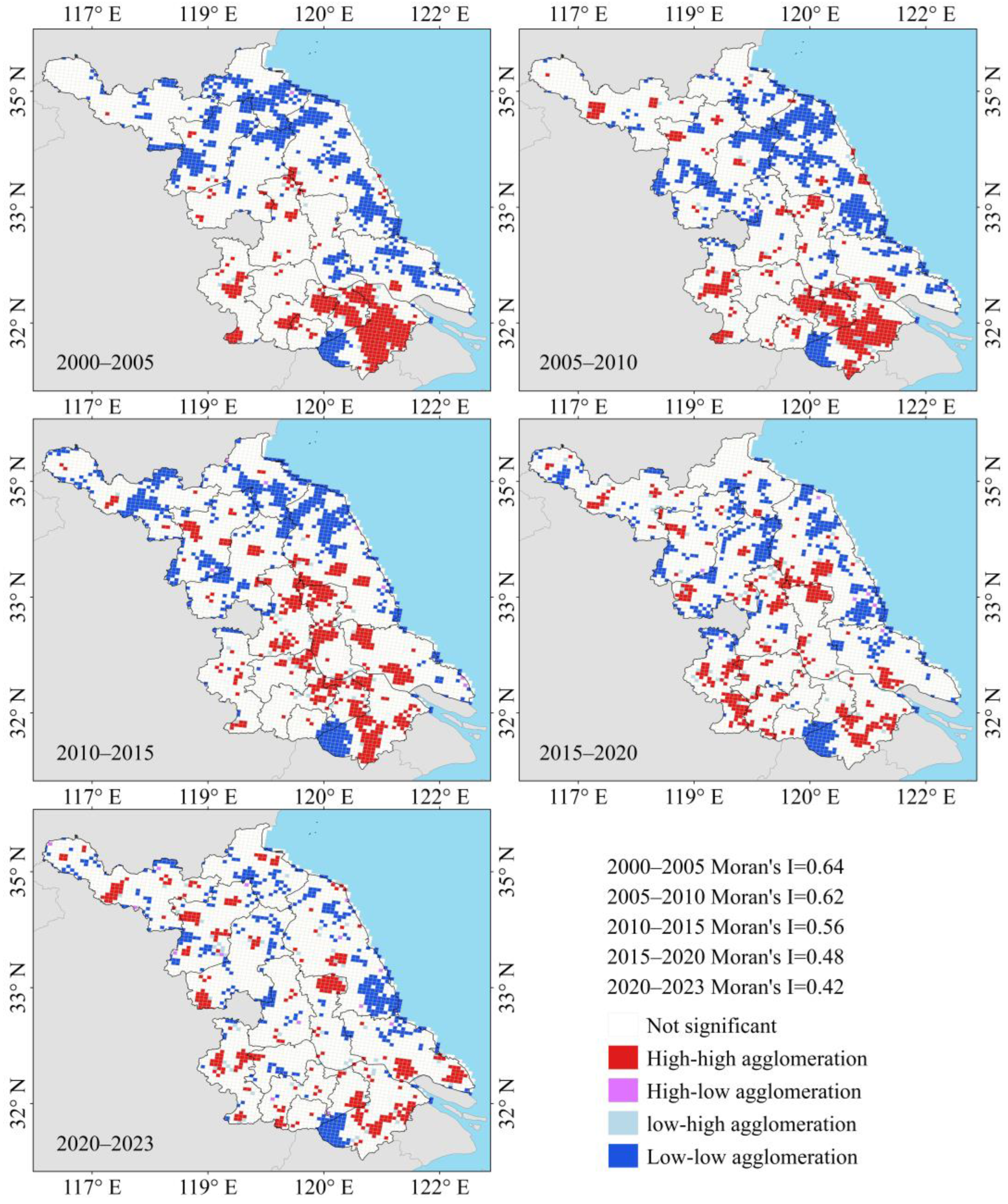 Figure 4, the spatial aggregation of the non-agriculturalization rate of cultivated land in Jiangsu Province exhibits a spatiotemporal evolution pattern characterized by a weakening of global aggregation, an expansion of local hotspots along the river, and a stabilization of cold spots in northern Jiangsu. Moran’s I value declined from 0.64 between 2000 and 2005 to 0.42 from 2020 to 2023, indicating a continuous weakening of the global spatial aggregation of cultivated land non-agriculturalization rates. Furthermore, the inter-regional spatial correlation of non-agriculturalization has evolved from a state of ‘strong aggregation’ to one of ‘relative dispersion’.