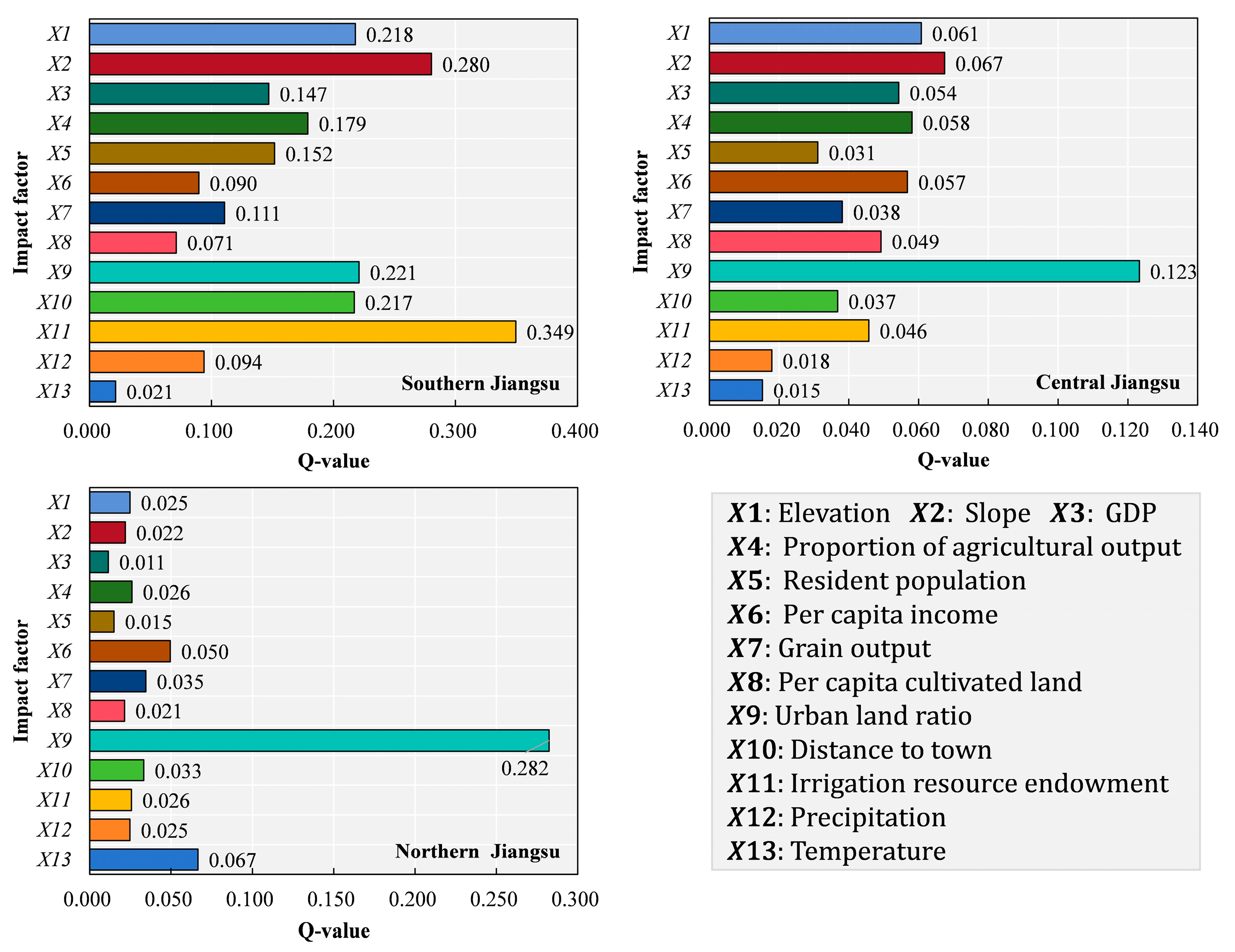Figure 9. The driving factors for the non-agricultural use of farmland in southern, central, and northern Jiangsu exhibit significant regional differentiation. In southern Jiangsu, the availability of irrigation resources stands out as the most critical driving factor. Conversely, in central Jiangsu, the proportion of urban land use has emerged as the primary driving factor, indicating that urbanization serves as the key impetus for the non-agricultural use of arable land in this region. The influence of other factors diminishes in a descending order, reflecting a comprehensive driving force that includes urbanization, terrain, agricultural economy, and population dynamics, with each factor’s impact being relatively more balanced compared to southern Jiangsu. In northern Jiangsu, the predominance of urban land use again emerges as the main driving factor, underscoring the significant role of urbanization in the non-agricultural utilization of arable land.