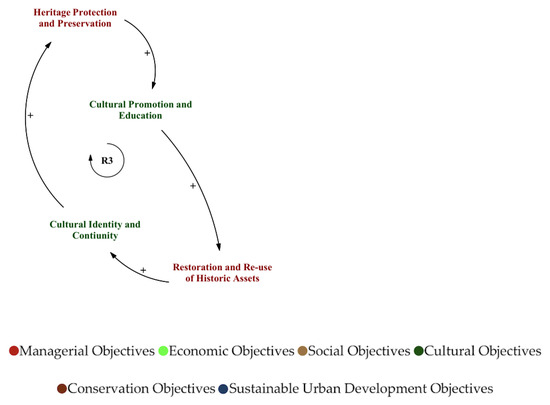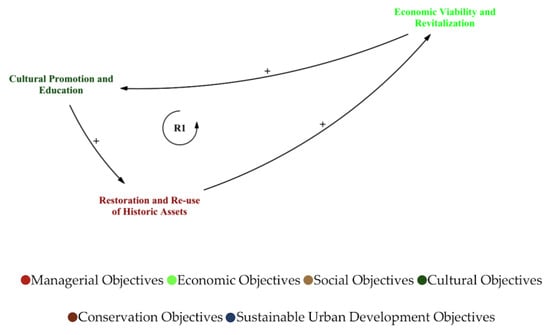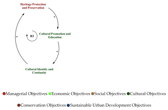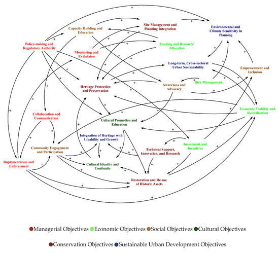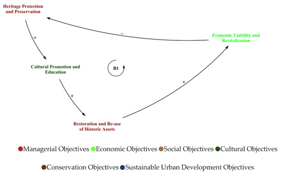 The causal loop diagram (Figure 1) was created using a color-coded scheme, with managerial objectives shown in red, economic objectives in green, social objectives in brown, cultural objectives in dark green, conservation objectives in burgundy, and sustainable urban development objectives in dark blue. Arrows depict interactions; black arrows indicate direct links between stakeholders’ related objectives. A positive interaction between variables is shown by a plus sign (+), while a negative interaction is shown by a minus sign (−).