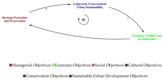 The B2-balancing loop (Figure 3) illustrates how economic growth and heritage conservation interact within urban sustainability. Heritage protection and preservation enhance long-term and cross-sectional urban sustainability by safeguarding cultural assets and integrating them into sustainable development frameworks [3]. Increased urban sustainability further boosts economic viability and revitalization by enhancing urban attractiveness, livability, and investment opportunities [144]. However, as economic growth accelerates, it can threaten heritage protection and conservation [145]. This feedback loop underscores the need to manage the trade-off between economic development and conservation integrity in sustainable urban growth. It also highlights, particularly in Türkiye, the importance of adopting sustainability-focused policies that connect heritage management with economic progress without sacrificing the authenticity and long-term preservation of historic urban landscapes.
