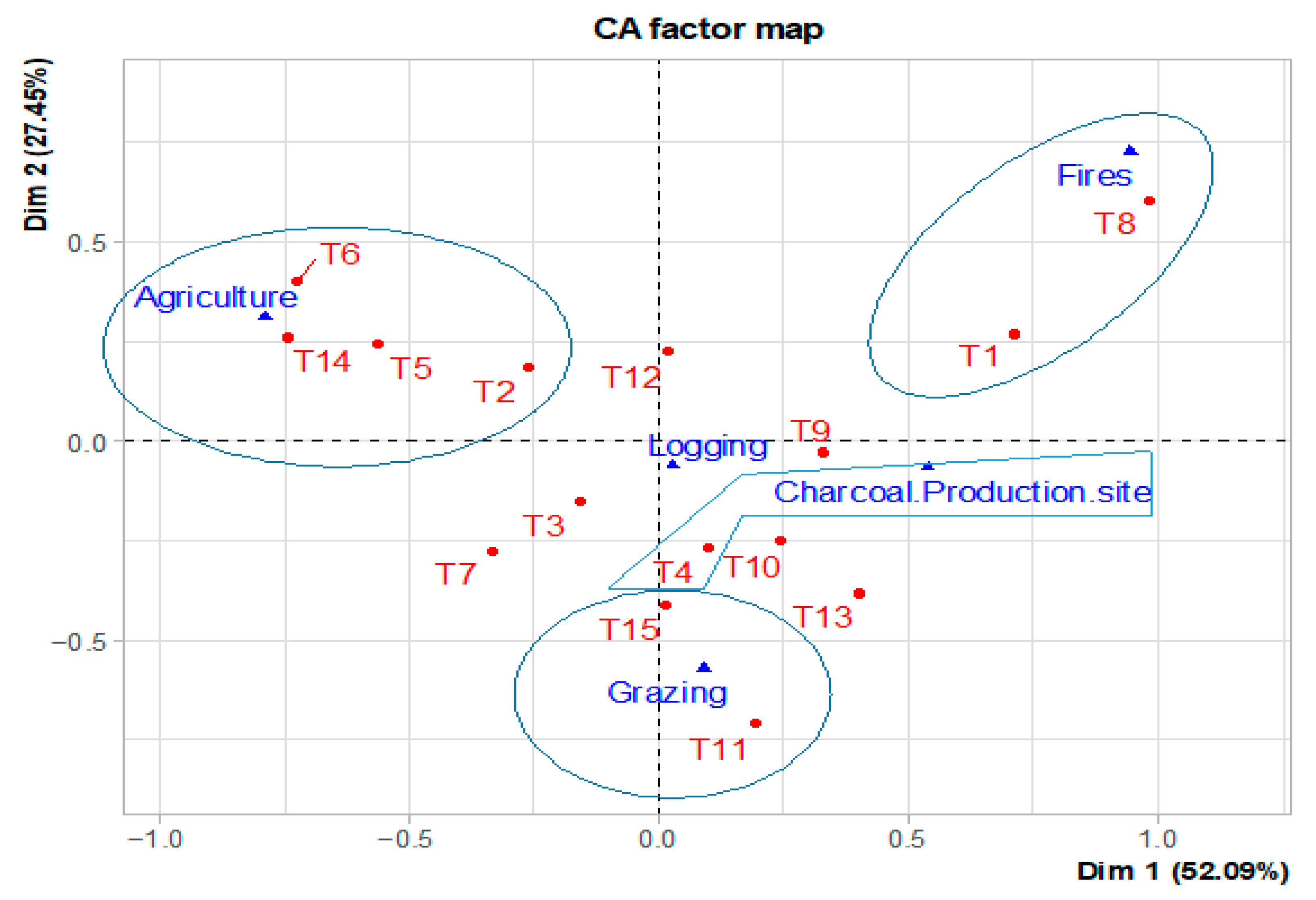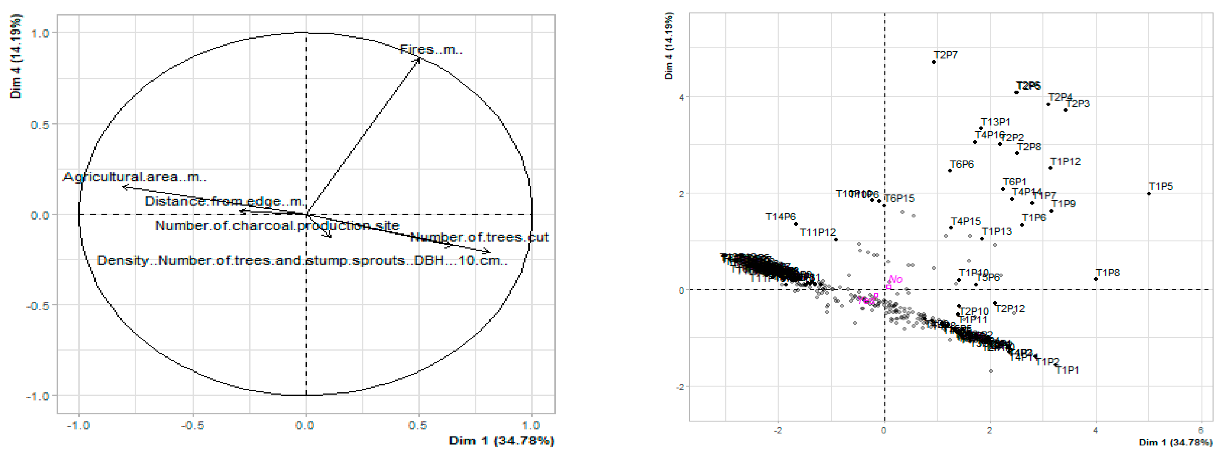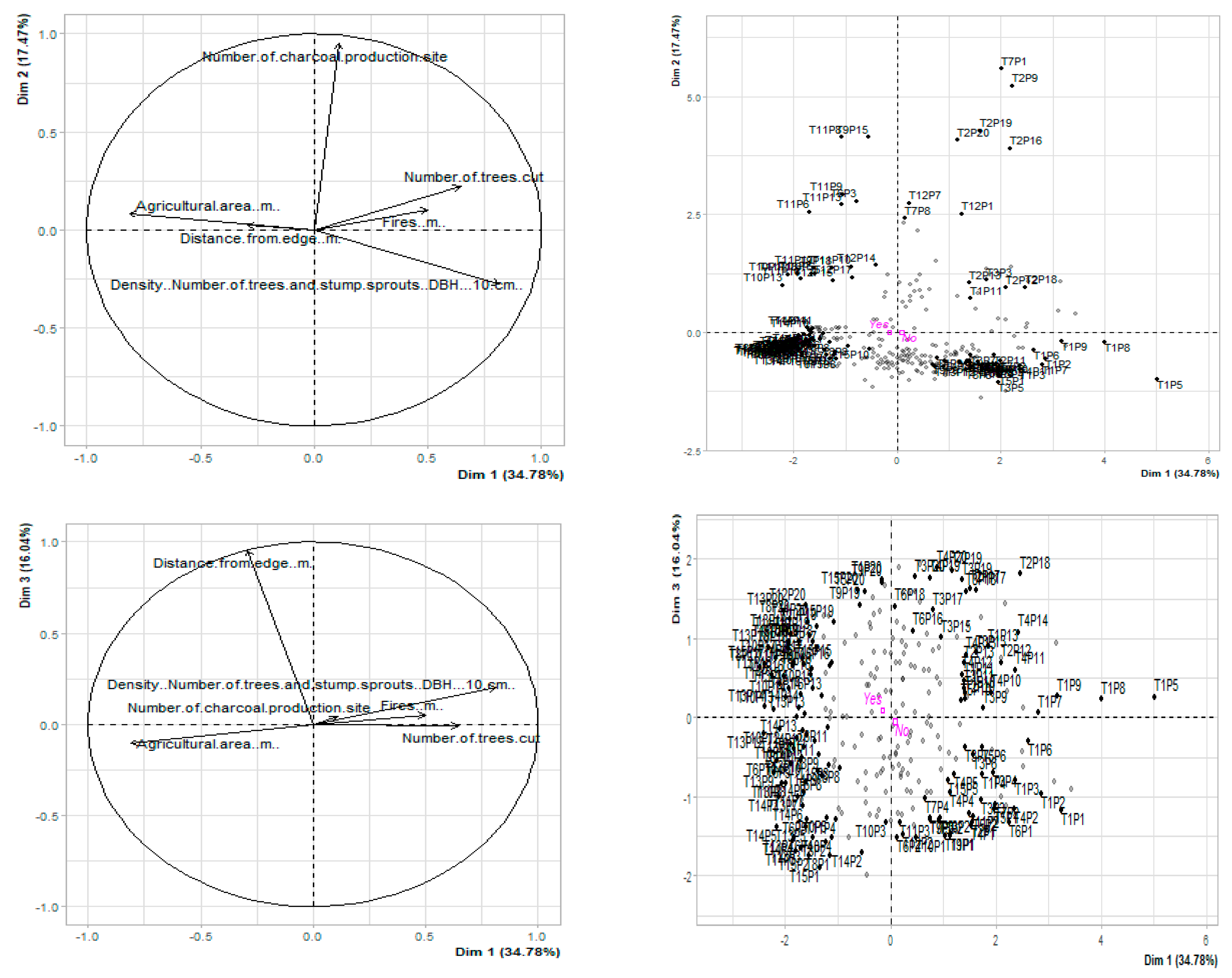 - Axis 2 was positively correlated with the number of charcoal production sites. This axis distinguished transects with low charcoal activity (e.g., T3, T8) from those with intensive charcoal production (e.g., T11, T12), revealing localized zones of energy-resource extraction.