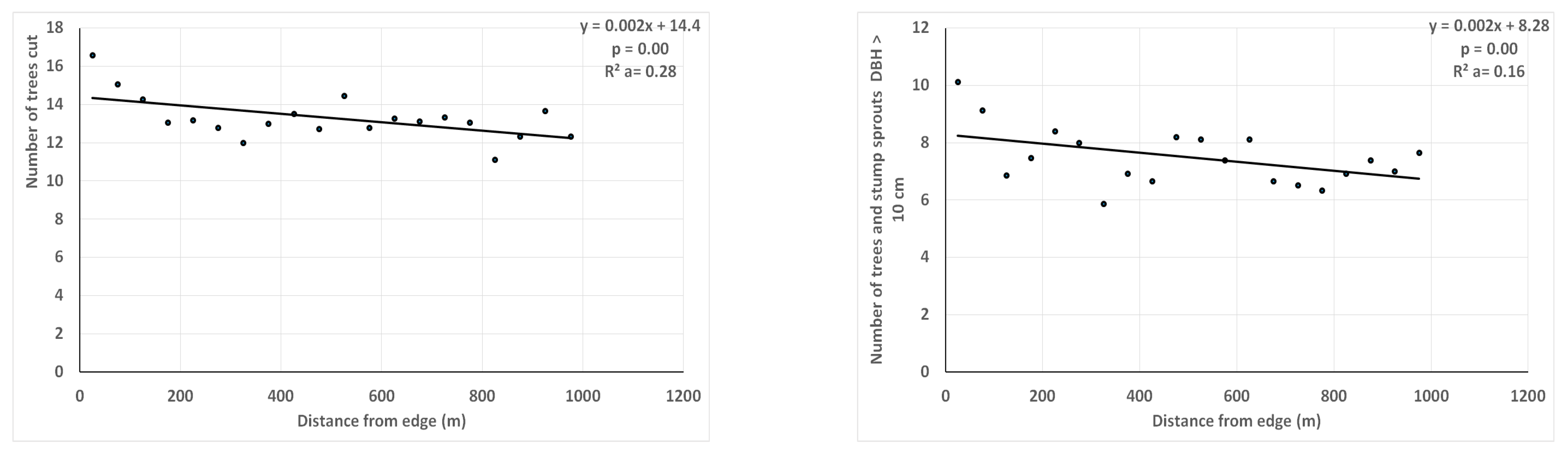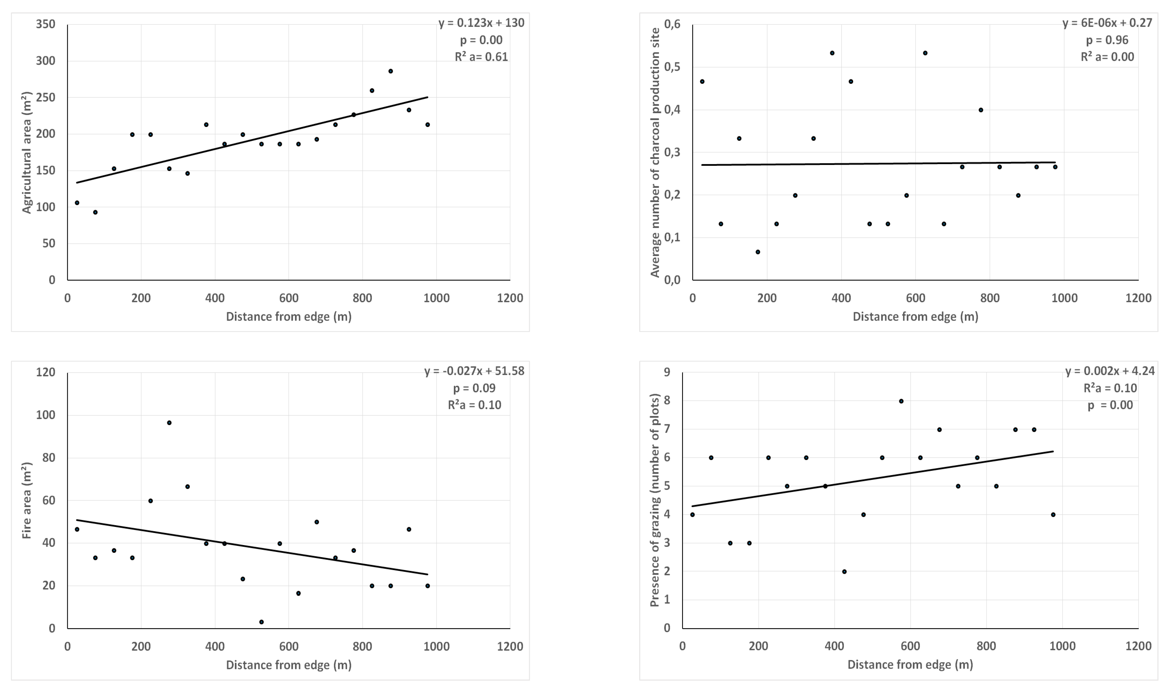 3.3. Linear Trend in Disturbances According to the Distance from Edge to the Interior of the Forest