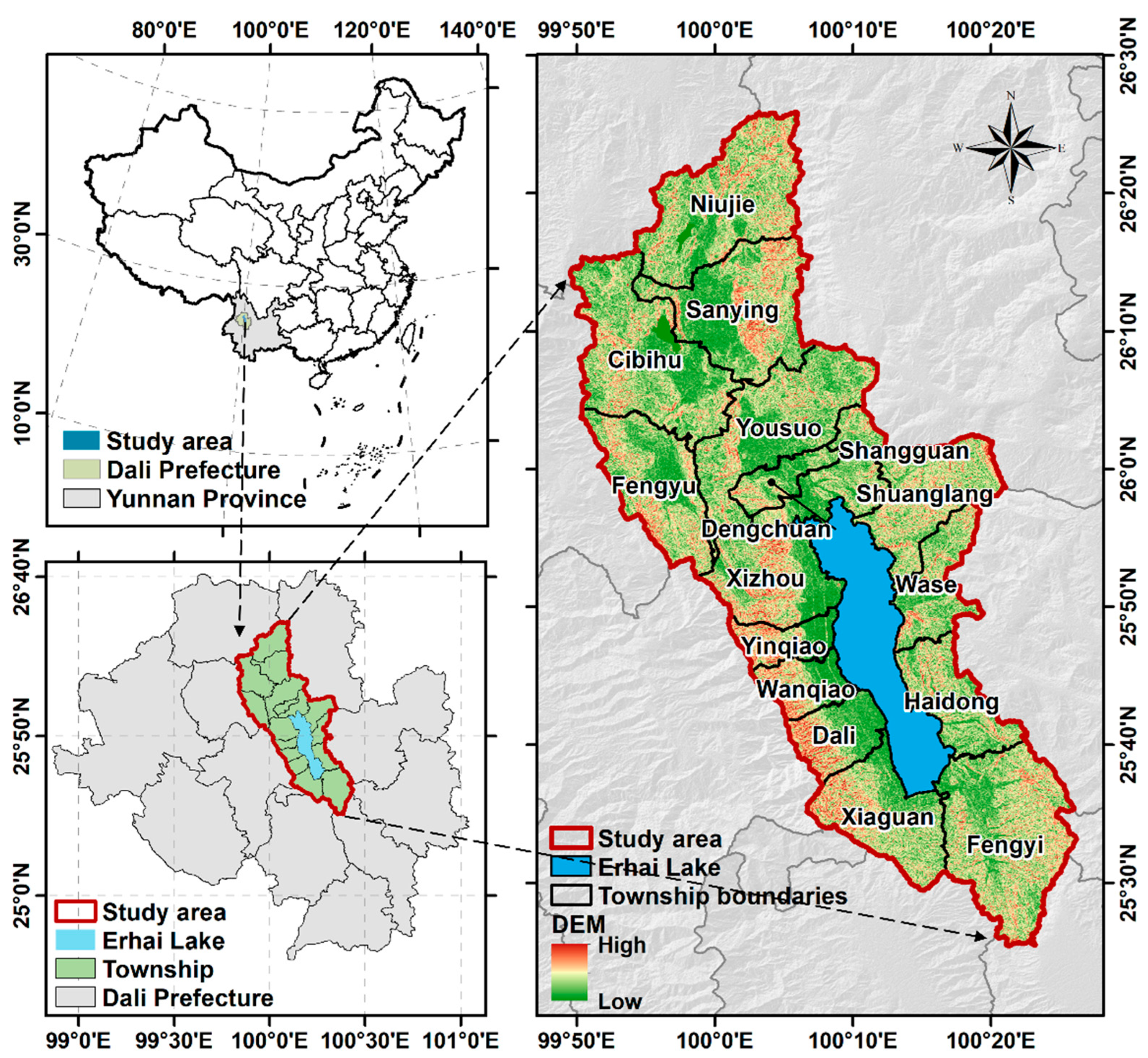 - Feng, Y.; Wu, F.L.; Zhang, F.Z. Environmental statecraft and changing spatial politics: Erhai Lake protection in China. Political Geogr. 2024, 115, 103196. [Google Scholar] [CrossRef]