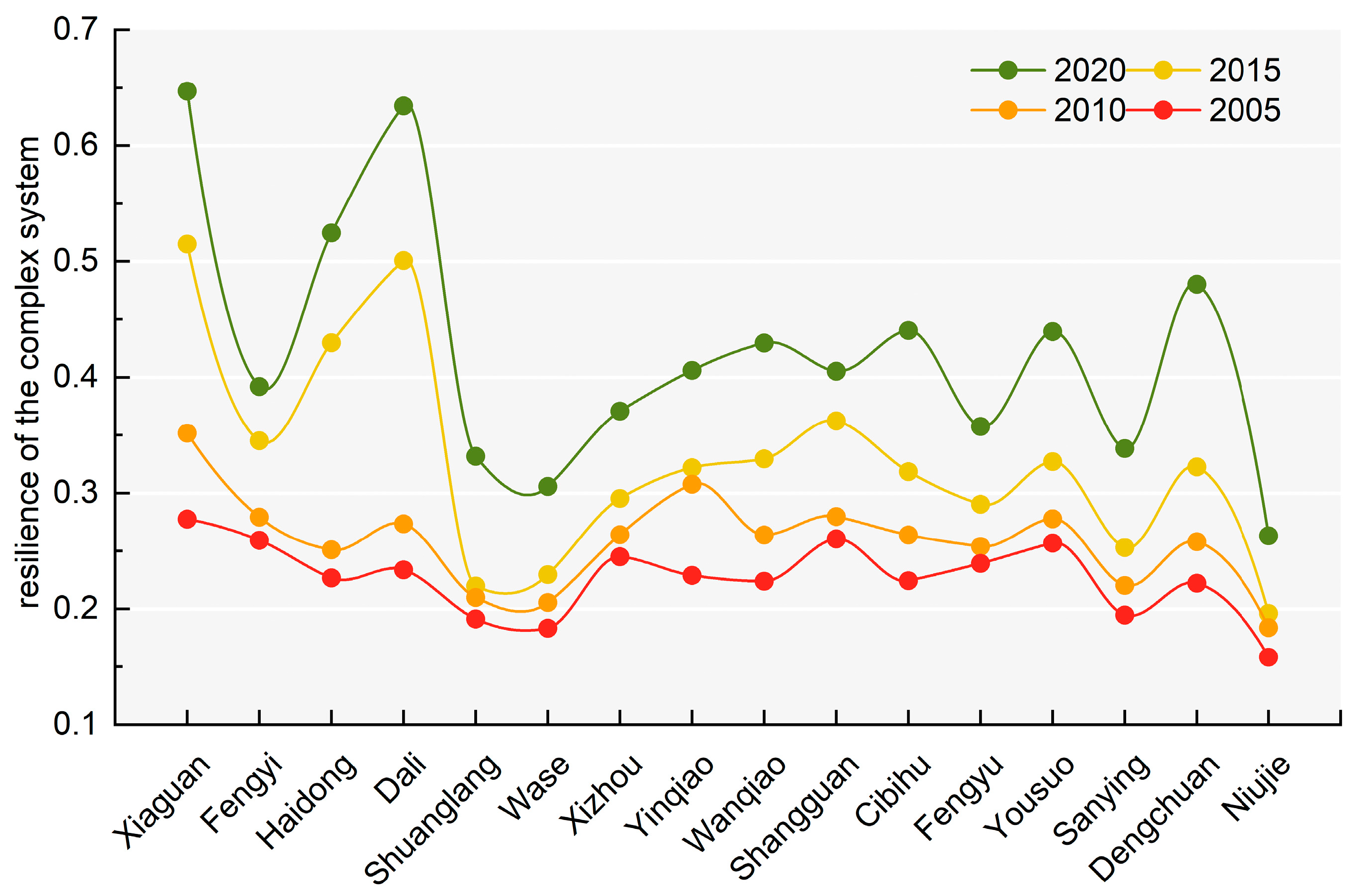 3.1. Spatial and Temporal Evolution of the Complex System Resilience in the Erhai Watershed