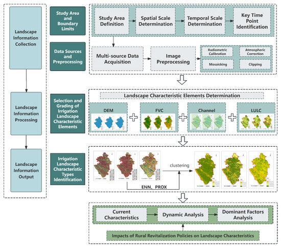The implementation of the Rural Revitalization Policies has progressively changed the landscape characteristics of the Dujiangyan Irrigation District. In addition, the sustainable development of the Dujiangyan Irrigation District is facilitated by the evolution of landscape characteristics, which is not solely driven by Rural Revitalization Policies. To address this, this paper uses a framework of “landscape information collection—landscape information processing—landscape information output” to thoroughly study how the landscape has changed and what it means for policies in the Dujiangyan Essence Irrigation District. The primary conclusions are as follows: