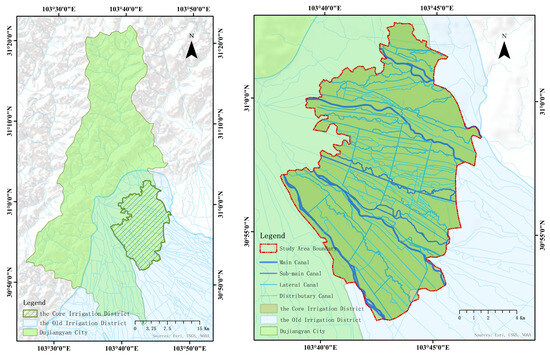 With the development of society and the economy, urbanization has continued to spread into rural areas, replacing traditional agricultural living spaces with highly intensive production and lifestyle patterns. The gradual encroachment of traditional agricultural land and rural settlements within irrigation districts has resulted in several problems, including the gradual loss of irrigation districts’ traditional characteristics and cultural heritage, as well as the destruction of landscape characteristics [1]. Against this backdrop, China has put forth the Rural Revitalization Strategy, which opens up new avenues for rural development by integrating the management of ecological and environmental problems in rural areas, the conservation of traditional landscape elements, and the continuation of agricultural civilization [2]. As the principal conduits for rural water management and land cultivation, irrigation district landscapes are essential to preserving rural landscapes, safeguarding regional heritage, and passing on unique agricultural civilization [3,4]. One prominent example of Chengdu’s Rural Revitalization Strategy in action is the Dujiangyan Essence Irrigation District. As a World Natural Heritage Site, World Cultural Heritage Site, and World Irrigation Engineering Heritage Site, it has several qualities that make it valuable [5].
