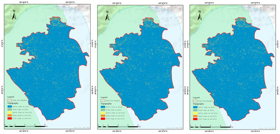 In terms of the topographic factor, the study followed the classification criteria and maximum elevation difference method proposed by Li et al. (2008) [23], using ArcGIS 10.4 to sort out elevation, topographic relief, and slope. Because of the high correlation between elevation, undulation, and slope, to reduce the cumulative impact of these three indicators, ArcGIS 10.4 was used to combine the elevation, topographic relief, and slope data from 2000, 2010, and 2020, creating maps of the terrain and topography (Figure 3). The terrain and topography were categorized into five classifications: gentle slope on plain, steep slope on plain, gentle slope on low hills, steep slope on low hills, and cliff slope on low hills.