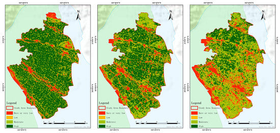 Based on the above calculation results, the ArcGIS 10.4 reclassification function was employed to categorize the vegetation coverage data for the study area in 2000, 2010, and 2020 into gradients (Figure 4).