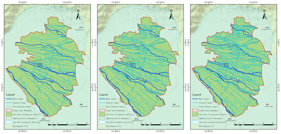 In terms of the hydrological features factor, the Dujiangyan Essence Irrigation District Channel System denotes a comprehensive water conveyance engineering network consisting of rivers, canals, irrigation channels, and drainage ditches. It is categorized into four tiers according to water utilization and irrigation expanse: main canals, lateral canals, distributary canals, and agricultural canals. These channels demonstrate stability, but the smaller channels beneath agricultural canals (minor canals) are predominantly seasonal and transient. Channels at all levels are interlinked, interacting and influencing each other, hence constituting the Dujiangyan Irrigation District Channel System [27]. Distribution information of the channel system is extracted using remote sensing imagery, digital elevation models, and other data through image processing, feature extraction, and model calculation techniques. The canal system is detected and evaluated in remote sensing imaging using attributes including color, texture, and geometry. The canal system is further validated and enhanced through ground surveys, field investigations, and historical satellite imagery, leading to the creation of canal system distribution maps for the study area in 2000, 2010, and 2020 (Figure 5).