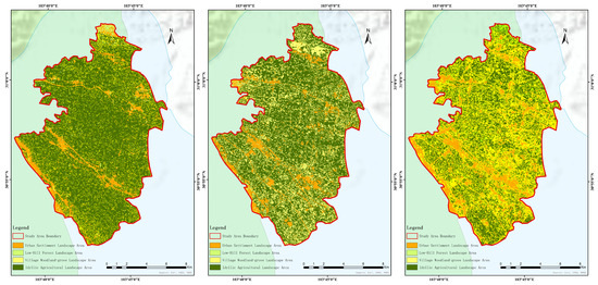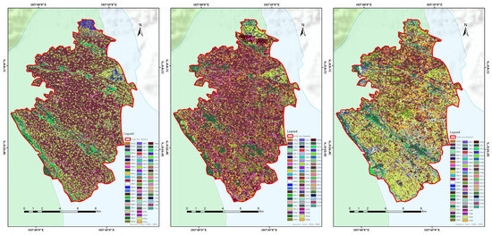 Land use categories are the basis of regional landscapes and serve as vital material resources for the production and daily activities of local inhabitants. Examining them facilitates a precise comprehension of landscape characteristics [28]. According to LULC classification standards and the prevailing land use conditions in the Dujiangyan Essence Irrigation District, the study area was categorized into six types: cultivated land, forest land, orchard land, water bodies, built-up land, and unused land [29]. The research employed a human–machine interaction analysis approach, utilizing ENVI 5.3 software to perform supervised classification of several land use categories within the study region. Spectral analysis and topographic characteristics were utilized to interpret farmland, water bodies, forests, and buildings within the study area’s sample objects. These findings were juxtaposed with high-resolution historical remote sensing images to extract information on diverse land use types, facilitating visual interpretation. The results were subsequently confirmed, yielding a Kappa coefficient of 0.91, surpassing the minimum accuracy threshold of 0.9 and fulfilling the research requirements [30]. Ultimately, high-resolution historical imagery from Shuijingzhu and Landsat imagery was utilized to provide training samples. The green space and building data in the study area’s land use data were rectified using the integration of manual visual interpretation and field verification procedures, utilizing comparisons with historical satellite imagery maps. Green spaces were classified into two categories: forest land and orchard land, while building land was divided into unused land and built-up land. The LULC for the study area in 2000, 2010, and 2020 was acquired (Figure 6).