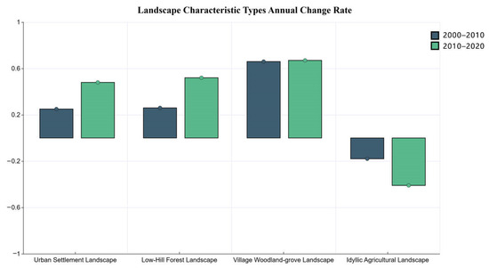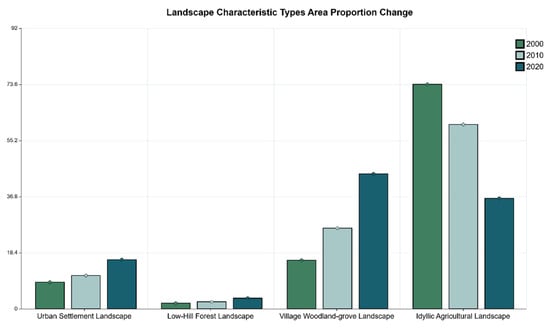 In 2000, 2010, and 2020, the preliminary landscape characteristic types were 69, 68, and 65 categories (Figure 7). However, the final landscape characteristic types exhibited stabilization, with the predominant landscape characteristics in the region consolidated into four categories (Figure 8): Urban Settlement Landscape (8.70–16.10%), Low-Hill Forest Landscape (1.82–3.47%), Village Woodland-Grove Landscape (15.89–44.23%), and Idyllic Agricultural Landscape (36.20–73.59%). Each final landscape characteristic type was a composite pattern consisting of many preliminary landscape characteristic types. Consequently, a singular preliminary landscape type might concurrently belong to many final landscape types. The low-altitude plain gentle slope urban-rural landscape (LPGm1) constituted both an element of the Urban Settlement Landscape and the Idyllic Agricultural Landscape (Appendix A).