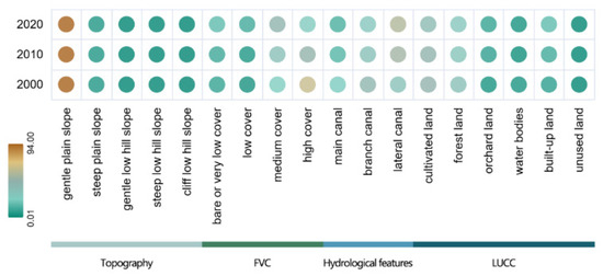 The influence of LULC changed relatively substantially between 2000 and 2020, as illustrated in Figure 12, in contrast to topographic, FVC, and hydrological features. This finding was consistent with the findings of Liu et al. (2021) in the Chengdu Plain [35]. Also, shifts in LULC were somewhat indicative of changes and influences in FVC and hydrological features. Consequently, this investigation employed LULC as the entry point, treating it as the dominant factor that influenced landscape characteristics changes, with its area value functioning as the dominant factor area value, to analyze the landscape characteristics of the Dujiangyan Essence Irrigation District.