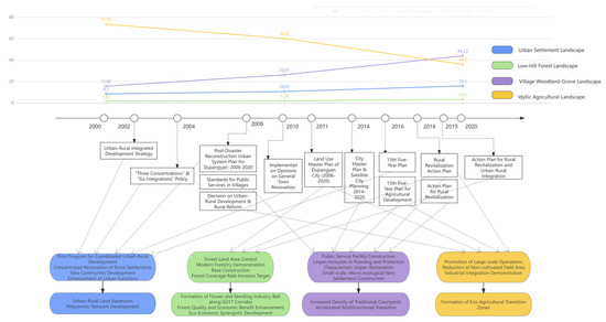 Under the impetus of rural revitalization policies, the regional landscape characteristics of the Dujiangyan Essence Irrigation District have undergone significant changes. An examination of the changes in various landscape characteristic types and their dominant factors allows for a comprehensive understanding of the impact of policies on the development of the district’s regional landscape characteristics (Figure 14). Specifically, the growth of the Urban Settlement Landscape is primarily attributed to the expansion of built-up land. From 2000 to 2020, the percentage of built-up land rose from 29.47% to 66.41%. The implementation of relevant policies has augmented the expanse of urban and industrial land, with the transformation of rural residential land resulting in an expansion of the Urban Settlement Landscape. In the Low-Hill Forest Landscape, the percentage of forest land has exhibited a consistent increase during the year, rising from 68.90% to 71.15%. The alterations in this landscape type are attributable to the expansion of forest land. The implementation of policies has partially facilitated the establishment of forestry industry bases, enhanced forest landscapes, and increased the number of flower and nursery decorative bases, which in turn has influenced changes in the Low-Hill Forest Landscape. The expansion of Village Woodland-gro Landscape is chiefly due to the transformation of forest land into built-up land, cultivated land, and orchard land. In the last 20 years, the percentage of built-up land has grown from 10.70% to 13.68%, while the percentage of cultivated land has increased from 21.25% to 50.33%. Designated farmhouse forests in western Sichuan province are recognized as vital local protected resources, attracting substantial investment and development, hence facilitating the swift expansion of farmhouse forest landscapes. This illustrates the significant function of farmhouse forests in enhancing rural living conditions and fostering rural industrial revitalization. The Idyllic Agricultural Landscape is predominantly characterized by cultivated land (54.20%) and forest land (31.96%). In 2000, cultivated land constituted 64.42% of the entire landscape area, but this figure dropped to 42.91% by 2020. In 2000, forest land comprised 23.37% of the total land area, rising to 44.62% by 2020. Chengdu City and Dujiangyan City have implemented a set of regulations for the Dujiangyan Essence Irrigation District. These policies are important steps to improve the area’s economy and society, aimed at meeting the needs of industrial growth and changing the scattered rural farms into a connected layout that meets today’s production standards. Their implementation has led to substantial alterations in the attributes and aesthetics of the Idyllic Agricultural Landscape.
