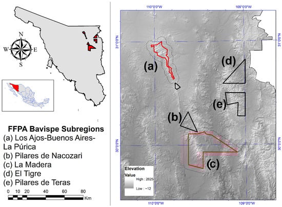 Location of the sections of the FFPA Bavispe in northeastern Sonora, Mexico. The sections considered in this study are highlighted in red: (a) Los Ajos–Buenos Aires and (c) La Madera. The 5 km buffer area is shown with a black outline.