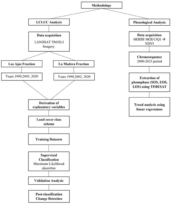 Flowchart illustrating the main methodological activities carried out for the land-use change and phenological trend analyses.