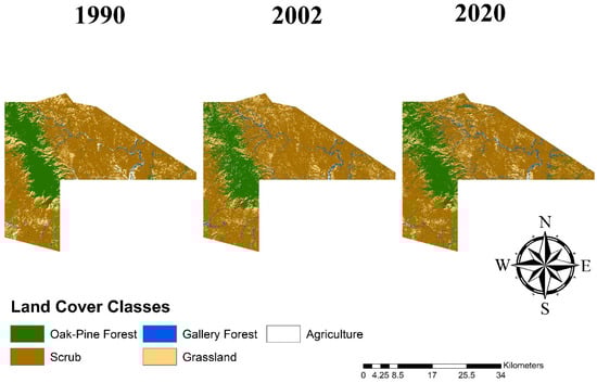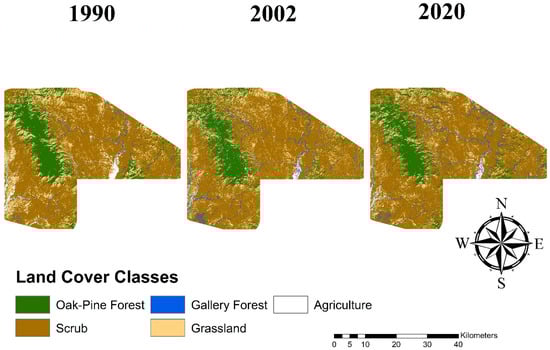 Land cover maps for 1990, 2002, and 2020 in the La Madera fraction.