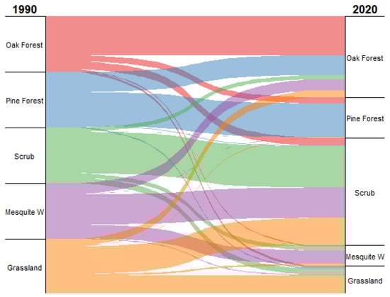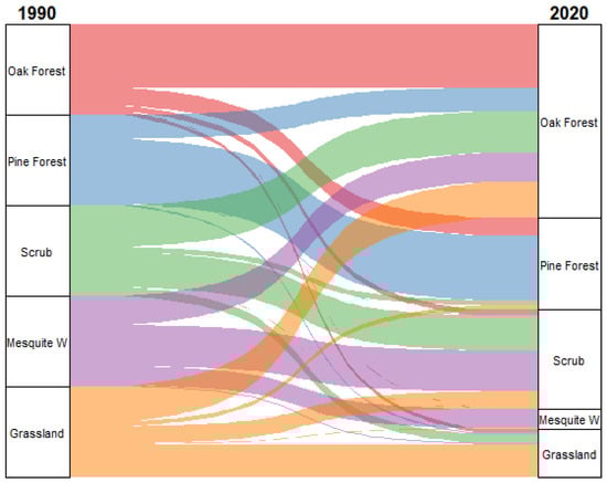 The results of this study indicate that between 1990 and 2020, the Los Ajos sector experienced a reduction of 81.41 hectares of pine forest, decreasing from 7033.14 ha in 1990 to 6947.73 ha in 2020. This change represents a loss of −1.214% relative to the original extent of this land cover type. In contrast, oak forest showed a notable expansion, increasing by 960.57 ha over the same period, from 8702.46 ha to 9663.03 ha, equivalent to an 11.03% increase from its initial area. Scrub exhibited the most dramatic transformation, expanding by 1322.64 ha, from just 101.34 ha in 1990 to 1423.98 ha in 2020, corresponding to a 1305.151% increase. Similarly, mesquite woodland experienced a substantial gain of 41.85 ha, growing from 101.34 ha to 1424.98 ha, which represents a 153.97% increase. Natural grassland, on the other hand, showed the most significant loss in spatial extent, with a reduction of 2239.65 ha, decreasing from 4261.41 ha in 1990 to only 2021.76 ha in 2020. This constitutes a −52.55% decline relative to its original area (Table 5). Changes and their magnitudes between land cover classes can also be observed (Figure 5).
