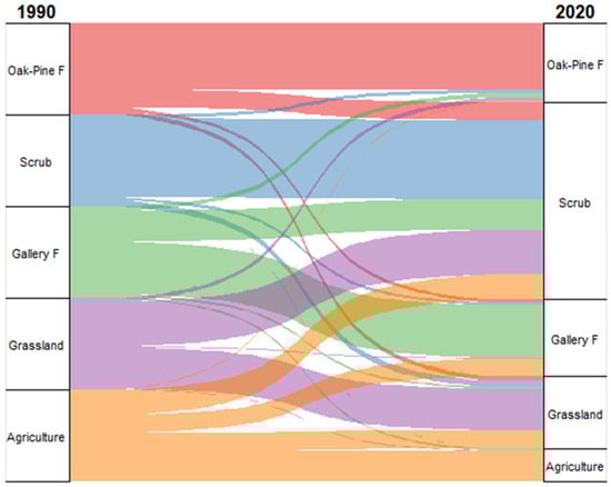 In the case of the La Madera sector, between 1990 and 2020, scrub remained the dominant land cover type, increasing by 1420.74 hectares, from 61,335.36 ha to 62,756.10 ha, representing a 2.316% expansion. Gallery forest also showed a significant increase, growing from 1603.89 ha to 3457.35 ha, which corresponds to a net gain of 1853.46 hectares or 115.56%. Oak-Pine Forest experienced a reduction of 852.84 hectares, decreasing from 19,638.81 ha to 18,785.97 ha, equivalent to a −4.343% loss in surface area. Grassland also declined, losing 1486.98 hectares, from 13,542.75 ha to 12,055.77 ha, corresponding to a −10.980% decrease, likely associated with the expansion of scrub. Finally, agricultural land showed a pronounced reduction of 934.38 hectares, dropping from 1374.30 ha to 439.92 ha, representing a −67.99% decrease from its original extent (Table 6). Changes and their magnitudes between land cover classes can also be observed (Figure 6).