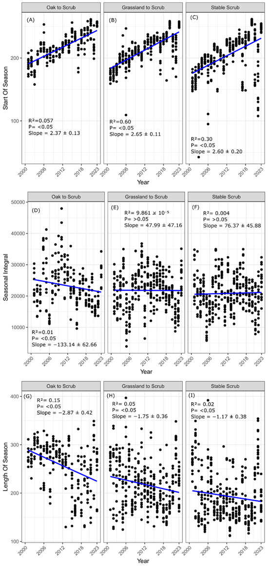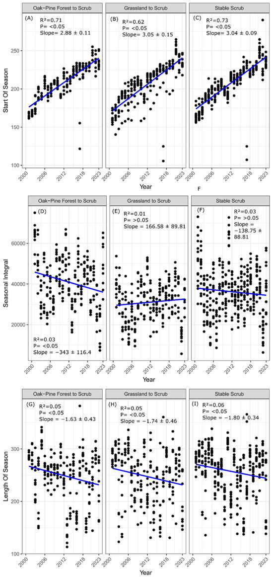 Regarding the length of season (LOS), for the Los Ajos fraction, significant differences were observed across all three land cover categories (Figure 11). The transition from oak to scrub (Figure 11G) shows a season length shortened by 2.8 days per year (R2 = 0.1591, p < 0.05). In the transition from grassland to scrub (Figure 11H), the decrease was 1.7 days per year (R2 = 0.05885, p < 0.05). Lastly, in stable scrubland (Figure 11I), the season length decreased by 1.17 days per year (R2 = 0.02199, p < 0.05). Similarly to Los Ajos, La Madera also shows significant differences for all the cases analyzed (Figure 12). In the transition from oak-pine to scrub (Figure 12G), the season length decreased by 1.6 days per year, (R2 = 0.05185, p < 0.05). In the grassland-to-scrub transition (Figure 12H), the reduction was 1.74 days per year (R2 = 0.05189, p < 0.05). Finally, stable scrub (Figure 12I) exhibited a decrease of 1.80 days per year (R2 = 0.06924, p < 0.05).
